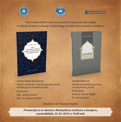 We are honored and pleased to invite you to the promotion of books from the University of Sarajevo Oriental Studies Institute Special Editions - Uvod u historiju i teriju poetske norme mesnevija na turskom jeziku (Introduction to the history and the Mesnevi poetic norms theory in Turkish) by Amina Šiljak-Jesenković and Kaside bosanskih pjesnika na arapskom jeziku by Dr. Dželila Babović.