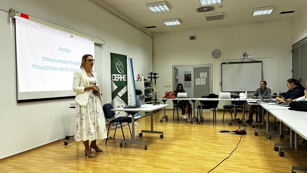 On behalf of the University of Sarajevo, the participants were welcomed by Vice-Rector Prof. Dr. Dženana Husremović. The MAGNET project was presented by the coordinator, Prof. Dr. Katerina Kedraka from Democritus University of Trace, and the MAGNET platform for Massive Open Online Courses (MOOC) was presented by Christos Kaltsidis. The DERHE project was presented by Dr. Almira Konjić from the Faculty of Agriculture and Food Science, University of Sarajevo, and the DIGIedu and TRAIN projects by Amra Kapo and Jasmina Gradaščević-Pleh from the University of Sarajevo.