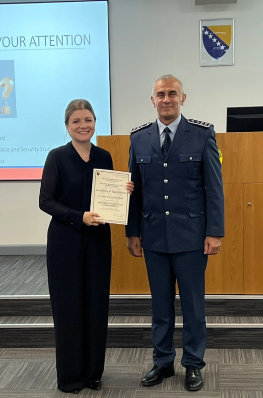 Sa ponosom obavještavamo da je doc. dr. Nerma Halilović-Kibrić, imala čast održati predavanje na temu Globalna i regionalna sigurnost, te svojim predavanjem otvoriti NATO-akreditirani kurs Defence Attaché Orientation Course in Defence and Diplomacy, koji se održava od 08. do 13. juna 2025. godine u Centru za obuku za operacije podrške miru (PSOTC). Ovo je druga godina zaredom da docentica Halilović-Kibrić aktivno učestvuje u realizaciji ovog značajnog međunarodnog kursa, čime Fakultet za kriminalistiku, kriminologiju i sigurnosne studije Univerziteta u Sarajevu nastavlja potvrđivati posvećenost akademskoj izvrsnosti i aktivnom doprinosu u oblasti međunarodne sigurnosti i odbrane. Zahvaljujemo se PSOTC timu na pozivu i uspješnoj saradnji.