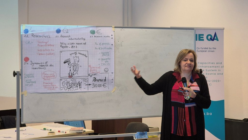 Središnja tema trodnevnog programa bila je razvoj i implementacija višedimenzionalnog modela unutarnjeg osiguranja kvaliteta (IQA), koji objedinjuje standarde izvrsnosti u područjima upravljanja, naučno-istraživačke djelatnosti, saradnje s privredom, nastave, društvene odgovornosti i javne komunikacije. Model je predstavljen kao dinamičan system koji podupire strateški razvoj visokoškolskih institucija, s posebnim naglaskom na nauku kao temelj kvaliteta VŠ ustanova, kao i na podršku mladim istraživačima, doktorantima i mobilnosti istraživača. Drugog dana posjete održane su interaktivne radionice usmjerene na analizu i prilagodbu upitnika za implementaciju IQA modela u partnerskim visoko-obrazovnim institucijama. Korištenjem metoda samoevaluacije, refleksije i učenja kroz razmjenu iskustva, sudionici su identificirali ključne prednosti, izazove te razvojne prioritete svojih internih sistema kvaliteta.