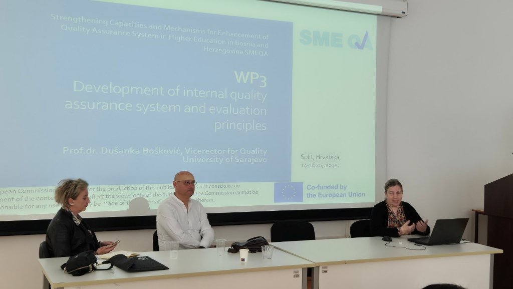U okviru ERASMUS+ CBHE projekta “Strengthening Capacities and Mechanisms for Enhancement of Quality Assurance System in Higher Education in Bosnia and Herzegovina” - SMEQA, od 14. do 16. aprila 2025. godine u Splitu je održana trodnevna radionica koja je tematski bila usmjerena na interno osiguravanje kvalitete na visoko-obrazovnim sutanovama s naglaskom na predstavljanje iskustva Sveučilišta u Splitu, koje je ujedno bilo i domaćin ovog događaja. Radionica je održana u sklopu radnog paketa “Razvoj sistema internog osiguranja kvaliteta i principi samoevaluacije” kojim rukovodi Univerzitet u Sarajevu, i kojeg su predstavljali voditeljica projekta prof. dr. Dušanka Bošković, prorektorica za kvalitet, prof. dr. Majda Čohodar Husić, prof. dr. Aleksandra Nikolić i Adnan Kafedžić, Šef službe za osiguranje kvaliteta.