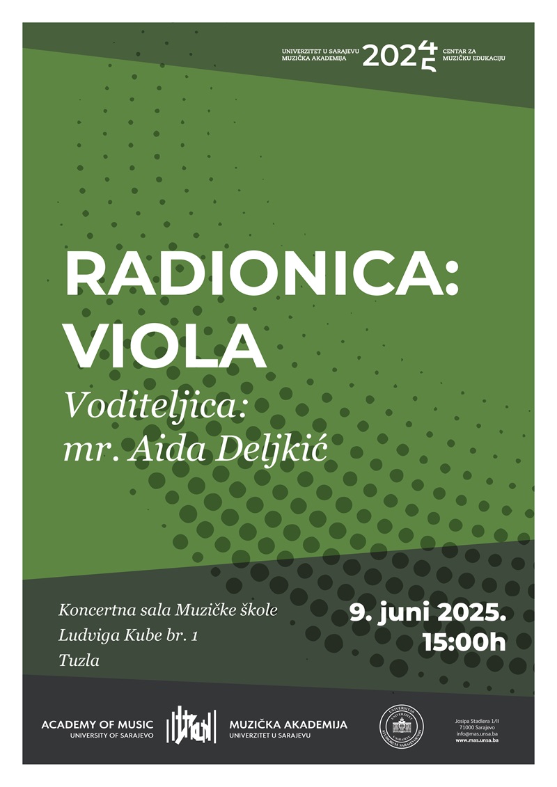 Centar za muzičku edukaciju Muzičke akademije Univerziteta u Sarajevu najavljuje realizaciju radionice za učenike i nastavnike viole OMŠ Tuzla i SMŠ „Čestmir Mirko Dušek“ Tuzla, a potom i cjelovečernji koncert. Voditeljica radionice je v. ass. mr. Aida Deljkić (UNSA – MAS).