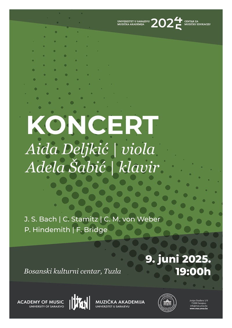 Koncert: mr. Aida Deljkić, viola, mr. Adela Šabić, klavir, 9. 6. 2025. godine, 19,00 sati, Bosanski kulturni centar, Tuzla.