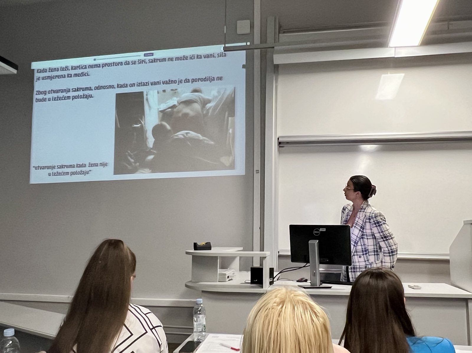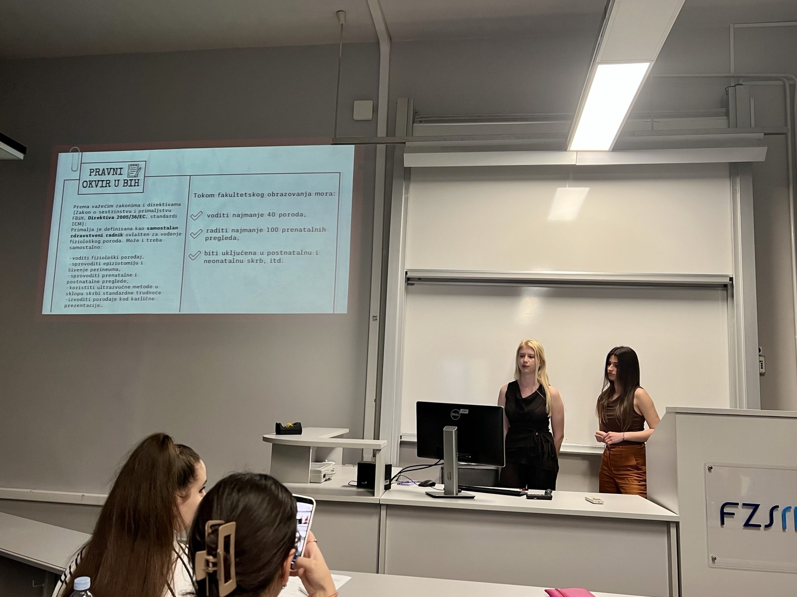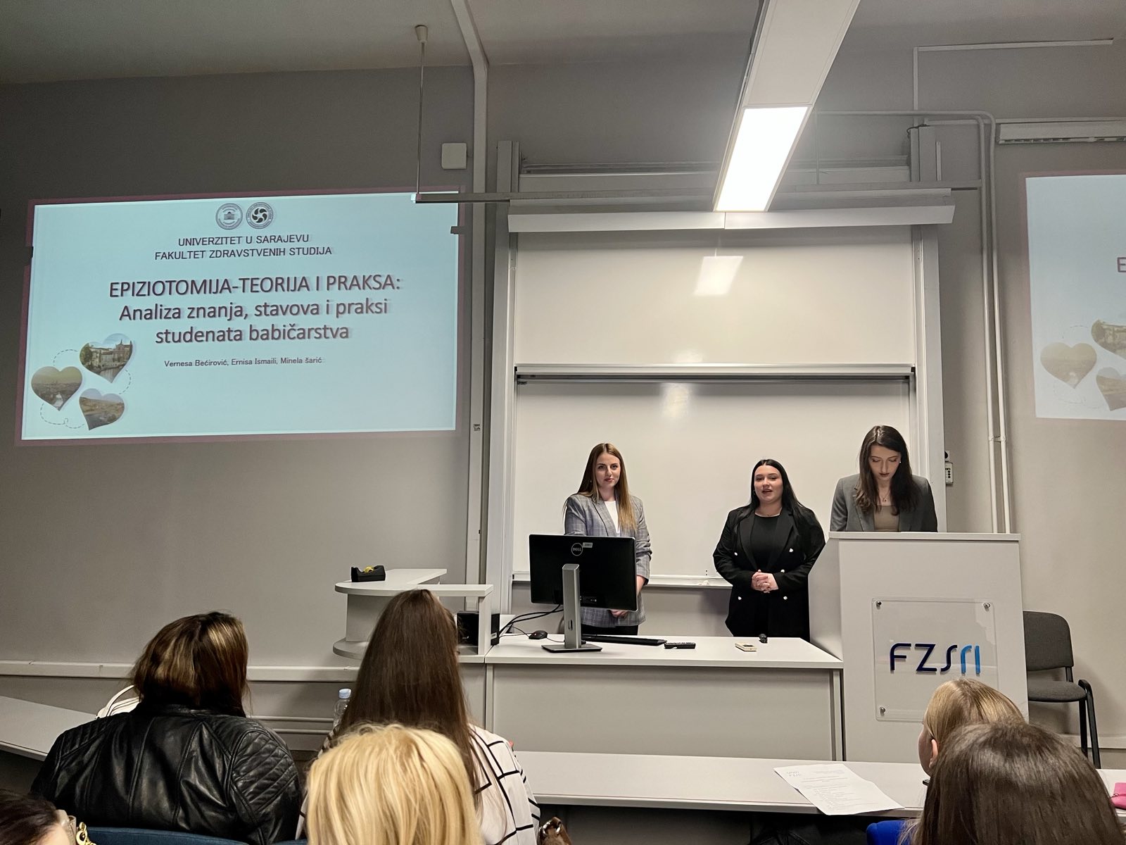 Studentice IV godine: Azra Nogo, Eldina Išćerić, Selma Kladničanin sa temom “Primalja – voditelj porođajnog procesa: Ko kontrolira rađaonicu i gdje su granice njene autonomije?” i Vernesa Bećirović, Minela Šarić, Ernisa Ismaili koje su prezentirale rad na temu “Epiziotomija – teorija i praksa: analiza stavova i iskustva studenata babičarstva”