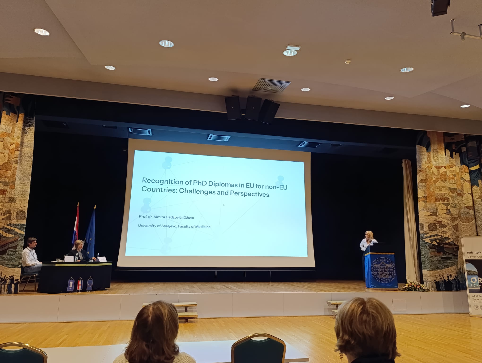 U okviru tematske sesije posvećene priznavanju diploma i međunarodnoj mobilnosti, profesorica Hadžović-Džuvo održala je izlaganje pod naslovom: “Recognition of PhD Diplomas in EU for Non-EU Countries: Challenges and Perspectives”. U svom izlaganju predstavila je ključne izazove i perspektive priznavanja doktorskih diploma stečenih izvan Evropske unije, s posebnim fokusom na harmonizaciju standarda, digitalizaciju procesa, te ulogu univerzitetskih partnerstava u stvaranju inkluzivnog akademskog prostora.
