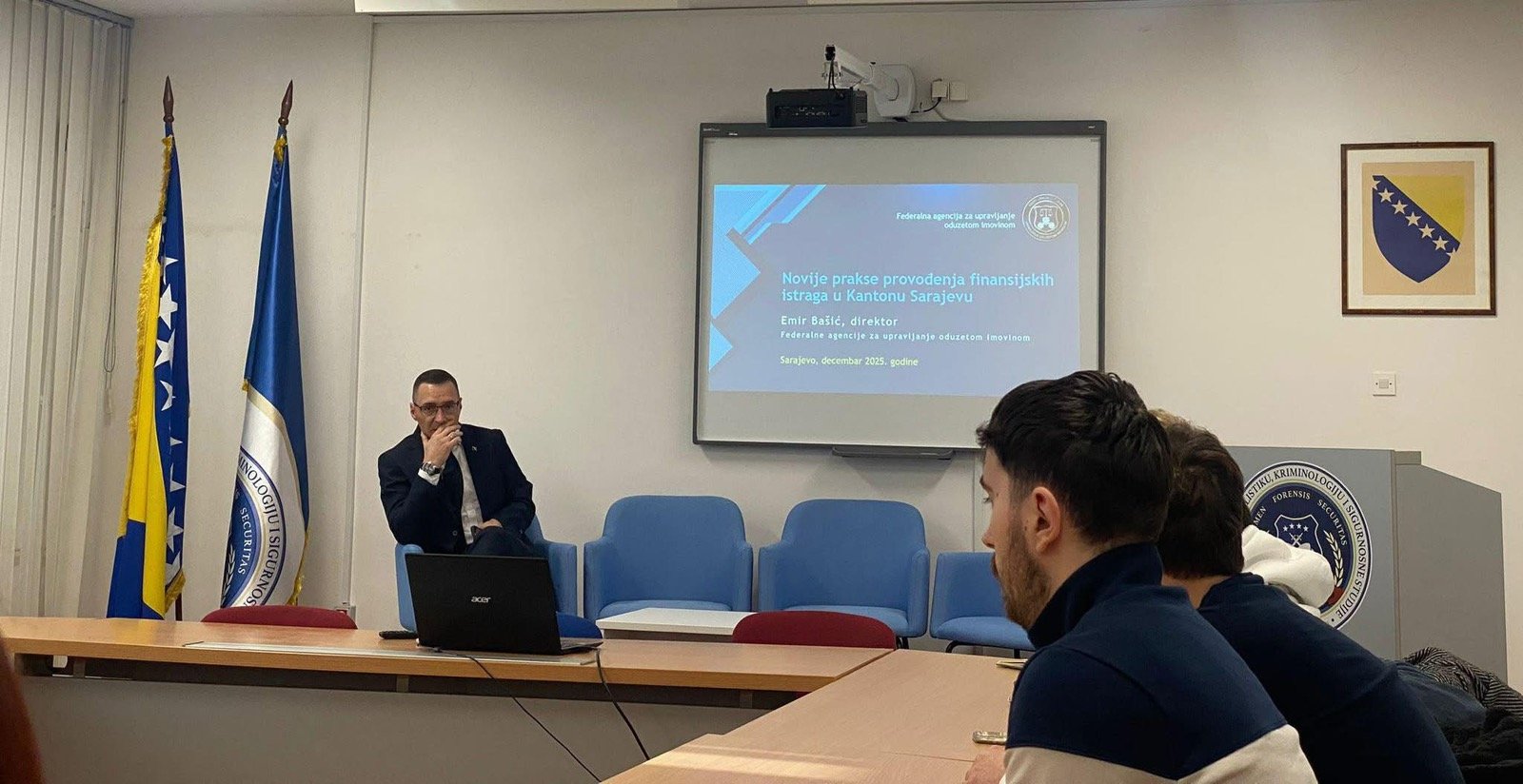 Direktor Federalne agencije za upravljanje oduzetom imovinom, Emir Bašić, održao je gostujuće predavanje studentima treće godine prvog ciklusa studija Fakulteta za kriminalistiku, kriminologiju i sigurnosne studije Univerziteta u Sarajevu, u okviru nastavnog predmeta „Finansijski kriminalitet i finansijske istrage“. Tom prilikom studentima su predstavljene nadležnosti i aktivnosti Agencije, kao i osnovni aspekti evropskih praksi u oblasti oduzimanja imovinske koristi pribavljene krivičnim djelima. Ovakvi oblici institucionalne i akademske saradnje imaju višestruki značaj, budući da doprinose produbljivanju stručnih znanja studenata, afirmaciji integrisanog pristupa između teorijskih koncepata i praktične primjene, te jačanju profesionalnih kompetencija budućih kadrova u oblasti kriminalistike, kriminologije i sigurnosnih studija.