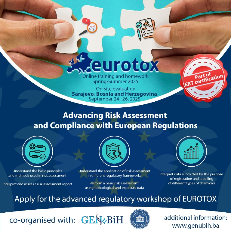 Završna faza radionice „Advancing Risk Assessment and Compliance with European Regulations“ koju je uz podršku EUROTOX-a (Federation of European Toxicologists & European Societies of Toxicology) i Univerziteta u Sarajevu organizovalo Udruženje genetičara u BiH, Sekcija za toksikologiju i mutagenezu, počela je 24. 9. 2025. je u Sarajevu u hotelu Holiday. Ova radionica predstavlja dio edukacije za ERT (European Registered Toxiologist) certifikaciju, što je za bh. toksikologe izuzetna prilika za unapređenje znanja i kompetencija. Među 30 učesnika radionice nalazi se 9 bh. istraživača i naučnih radnika od kojih je sedam sa Univerziteta u Sarajevu i to sa Farmaceutskog i Medicinskog fakulteta te Instituta za genetičko inženjerstvo i biotehnologiju.