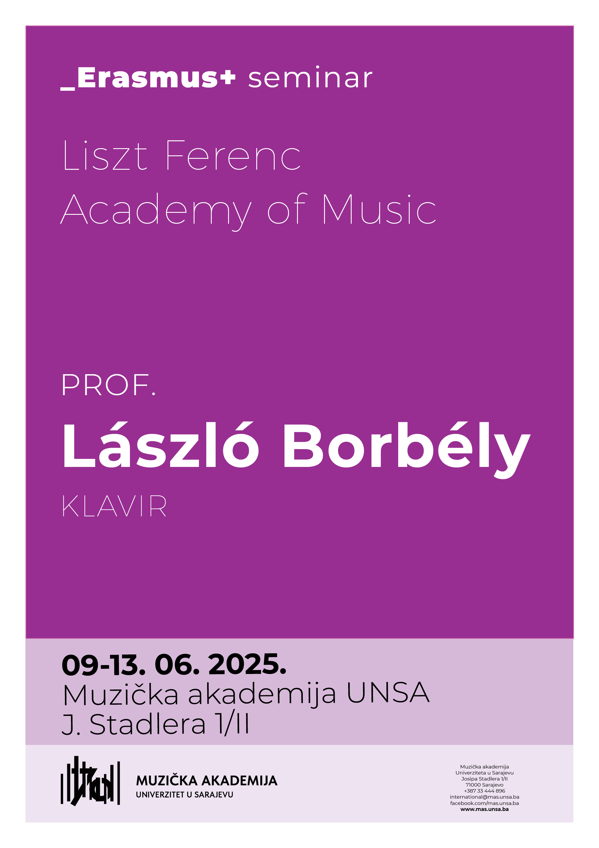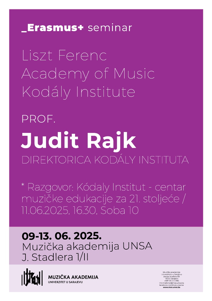 Muzička akademija Univerziteta u Sarajevu sa zadovoljstvom najavljuje gostovanje međunarodno priznatih umjetnika i profesora sa Muzičke akademije Franz Liszt u Budimpešti - Judit Rajk, vokalistice i direktorice Instituta Kodály, i pijaniste Lászla Borbélyja.