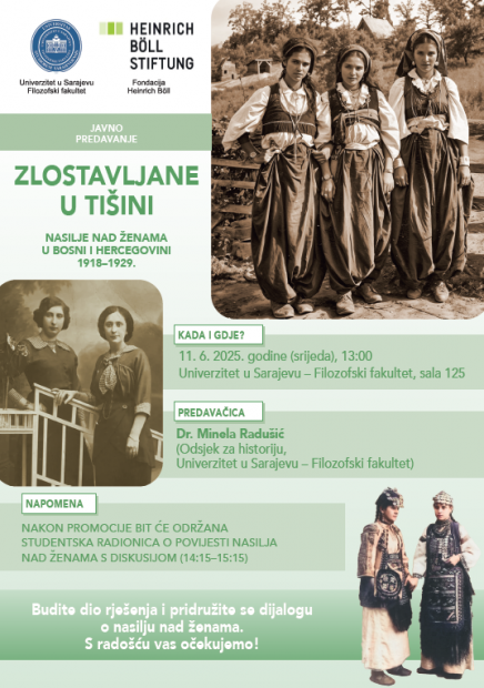 Dr. Minela Radušić (Odsjek za historiju Filozofskog fakulteta Univerziteta u Sarajevu) održat će javno predavanje na temu „Zlostavljane u tišini: Nasilje nad ženama u Bosni i Hercegovini 1918–1929."