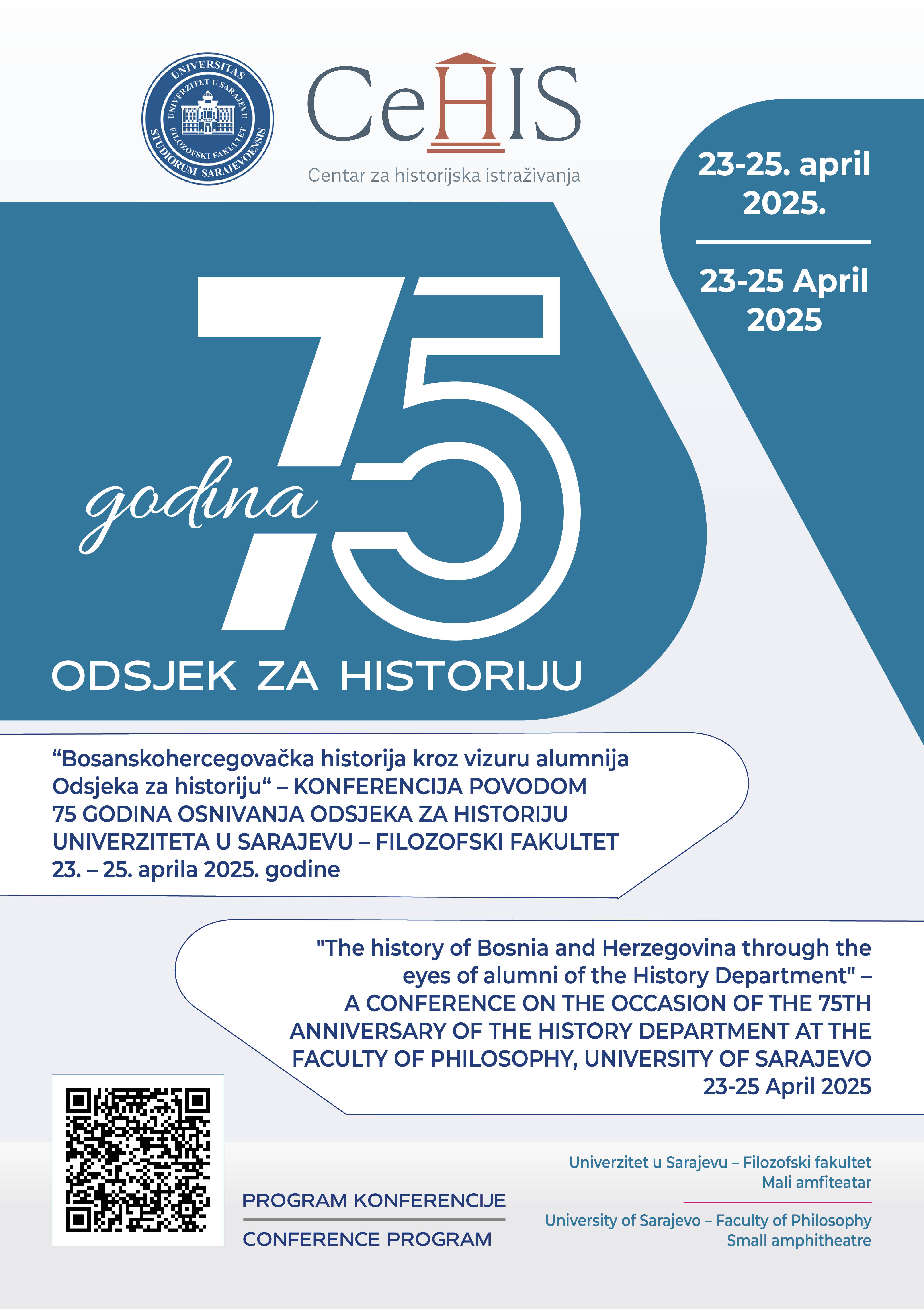 Centar za historijska istraživanja (CeHIS) organizuje konferenciju „Bosanskohercegovačka historija kroz vizuru alumnija Odsjeka za historiju“, povodom obilježavanja značajnog jubileja – 75 godina od osnivanja Odsjeka za historiju (Univerzitet u Sarajevu – Filozofski fakultet). Prema programu predviđeno je da konferencija  traje će tri dana 23 – 25. aprila 2025-godne. Sve aktivnosti će se održavati u Malom amfiteataru (Univerzitet u Sarajevu – Filozofski fakultet, Franje Račkog 1)