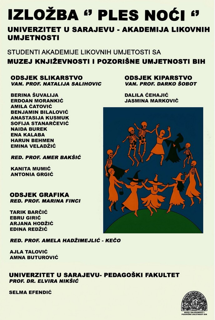 Muzej književnosti i pozorišne umjetnosti Bosne i Hercegovine u saradnji sa Univerzitetom u Sarajevu - Akademijom likovnih umjetnosti, pod mentorstvom van. prof. Natalije Salihović, te Pedagoškim fakultetom pod mentorstvom red. prof. Elvire Nikšić, organizuje zajedničku izložbu pod nazivom „Ples noći“.