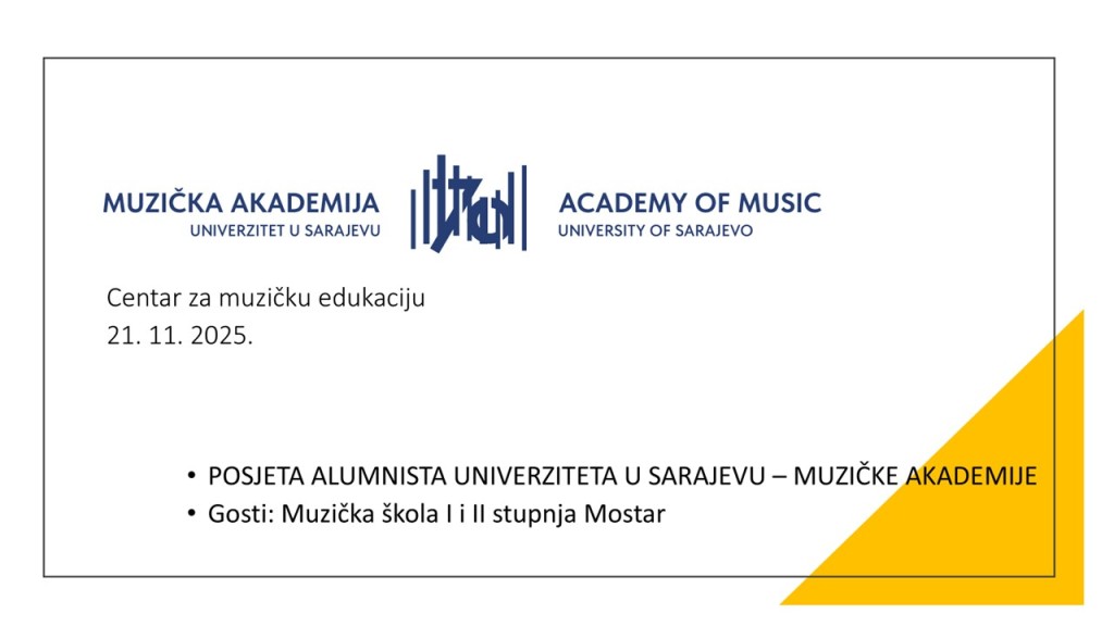 Na naše iznimno zadovoljstvo, dana 21. 11. 2025. godine Muzička akademija Univerziteta u Sarajevu ugostila je alumniste Akademije, Enu Brkić, prof, Bakira Memiševića, prof, Petru Perić, prof. i mr. Mirnu Šiširak, prof. Gosti alumnisti su uposlenici Muzičke škole I i II stupnja Mostar, te su ovom prilikom Muzičku akademiju posjetili zajedno s učenicima škole. Evocirajući uspomene, prisjećajući se aktivnosti i ostvarenih rezultata i uspjeha tokom studija na Univerzitetu u Sarajevu – Muzičkoj akademiji, te kroz razgovor sa šeficom Centra za muzičku edukaciju MAS prof. dr. Nermom Hodžić-Mulabegović učenicima su prenijeli dašak svojih studentskih dana.
