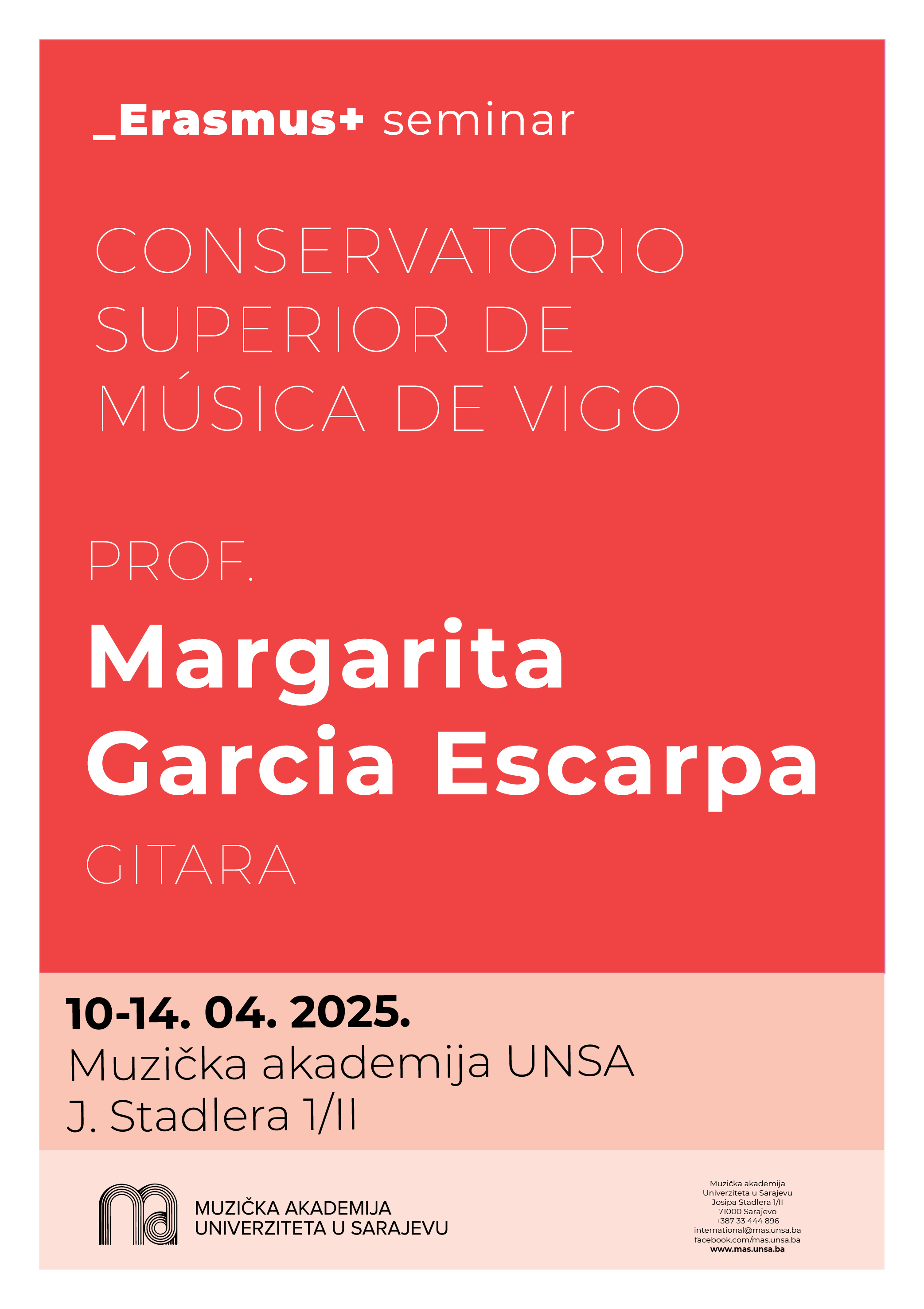 Muzička akademija Univerziteta u Sarajevu najavljuje gostovanje renomirane gitaristice i profesorice Conservatorio Superior de Música de Vigo (Španija) Margarite Escarpa, koja će od 10. do 14. aprila 2025. godine realizirati majstorsku radionicu za studente gitare. Gostovanje se ostvaruje u okviru programa Erasmus+ u kontinuiranoj dugogodišnjoj saradnji između odsjeka za gitaru dvije institucije, ali i Sarajevo International Guitar Festa.