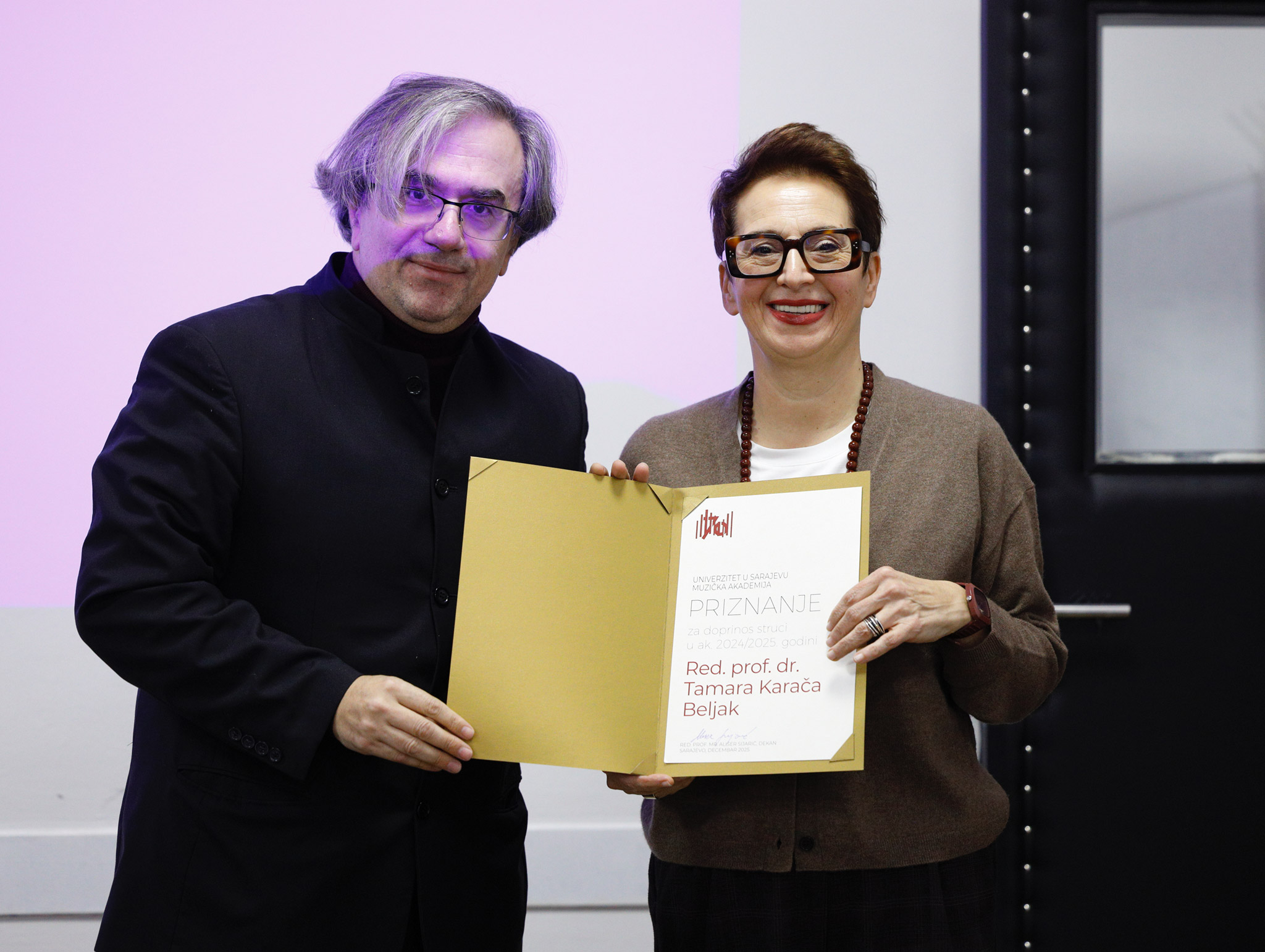 Nakon predstavljanja sadržaja monografije "70 godina Muzičke akademije Univerziteta u Sarajevu", kao svjedočanstva o radu i postignućima ostvarenim u protekloj deceniji (2015–2025), dekan prof. mr. Ališer Sijarić osvrnuo se na uspjehe akademskog osoblja tokom 2025. godine. Istakao je izuzetne rezultate ovogodišnjih dobitnica nagrada Univerziteta u Sarajevu te čestitao asst. dr. Hanan Hadžajlić (Nagrada za poseban doprinos umjetnosti za 2024. godinu), prof. dr. Belmi Alić (Nagrada za višegodišnji doprinos umjetnosti) i prof. dr. Nermi Hodžić-Mulabegović (Nagrada za doprinos u disciplinama od posebnog nacionalnog značaja za 2024. godinu), nakon čega je dodijelio godišnje nagrade Muzičke akademije UNSA.
