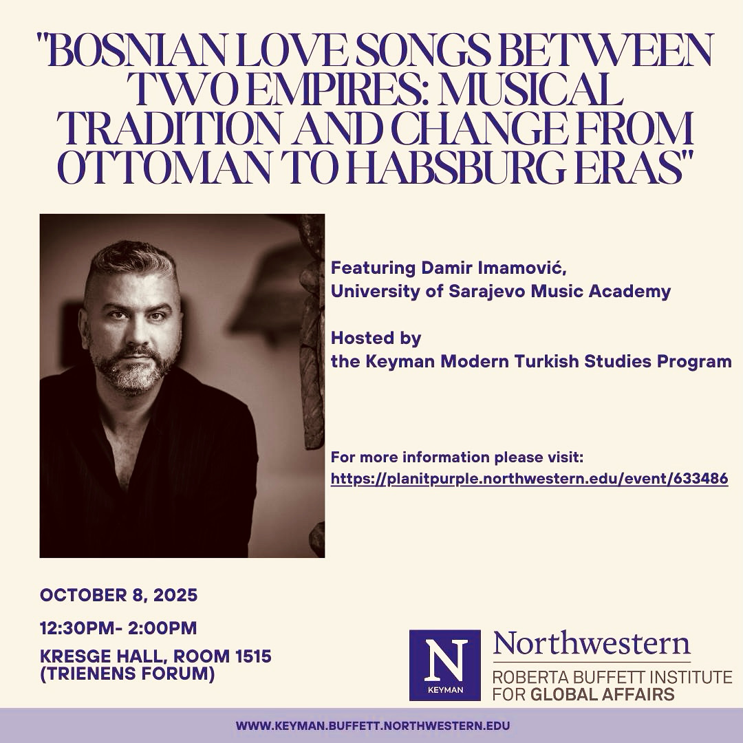 Viši asistent na Odsjeku za muzikologiju i etnomuzikologiju Muzičke akademije Univerziteta u Sarajevu, Damir Imamović (MA), u srijedu, 8. oktobra 2025. bio je gost na Institutu Roberta Buffet Northwestern Univerziteta u Chicagu. Tom prilikom održao je predavanje pod nazivom "Bosnian Love Songs Between Two Empires: Musical Tradition and Change From Ottoman to Habsburg Eras" u okviru Keyman Modern Turkish Studies programa. Predavanju su, pored studenata/ica ovog programa, prisustvovali i nastavnici muzikologije, etnomuzikologije i antropologije, kao i drugi gosti i gošće koji/e su se izlaganju i raspravi priključili putem Zoom platforme.