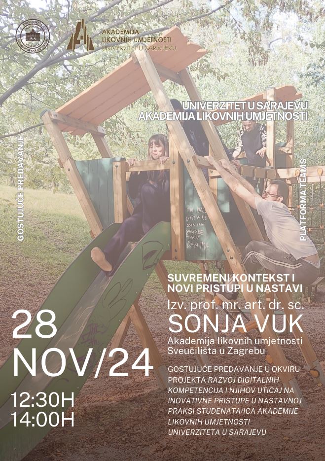 Gostujuće predavanje u sklopu projekta Razvoj digitalnih kompetencija i njihov uticaj na inovativne pristupe u nastavnoj praksi studenata/ica Akademije likovnih umjetnosti Univerziteta u Sarajevu, će realizirati izv. prof. mr. art. dr. sc Sonja Vuk uposlenica Nastavničkog odsjeka Akademije likovnih umjetnosti Sveučilišta u Zagrebu. Profesorica je angažirana na predmetima preddiplomskog i diplomskog studija Likovne kulture, kao što su: Hospitacije u nastavi likovne kulture (MA); Metodika kreativnog procesa (MA); Metodika nastave likovne kulture 1 (MA); Metodika nastave likovne kulture 2 – diplomski praktikum 1 i 2 (MA); Metodika nastave likovne kulture 2 – metodički praktikum 1 i 2 (MA); Suvremena vizualna umjetnost u metodičkoj praksi 1/N – izb i 2/N – izb (BA i MA); Uvod u likovnu terapiju / N – izb (MA).