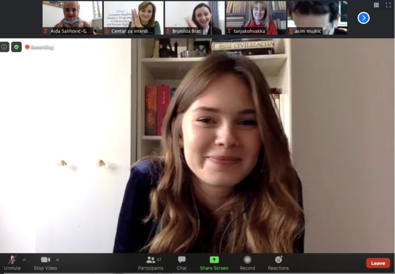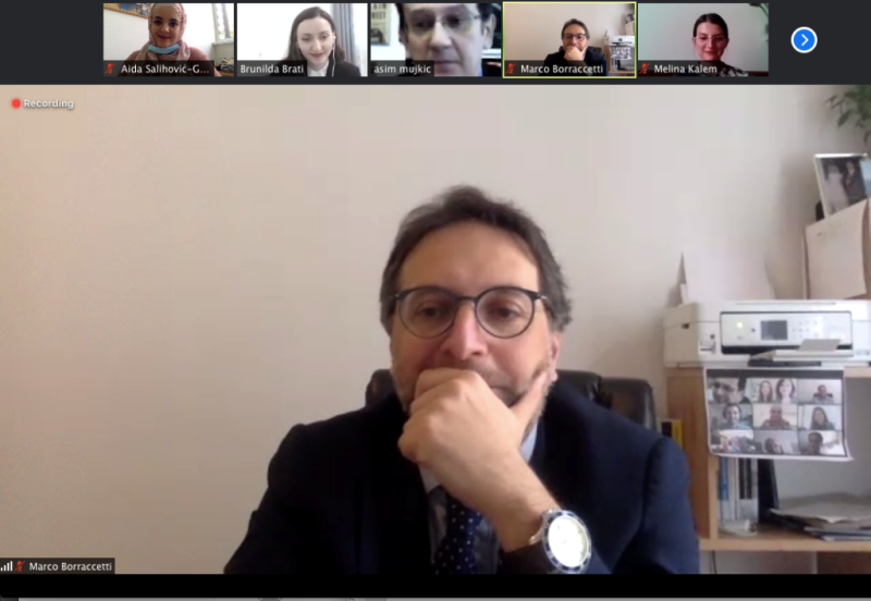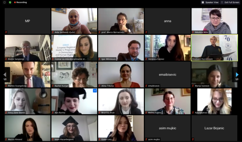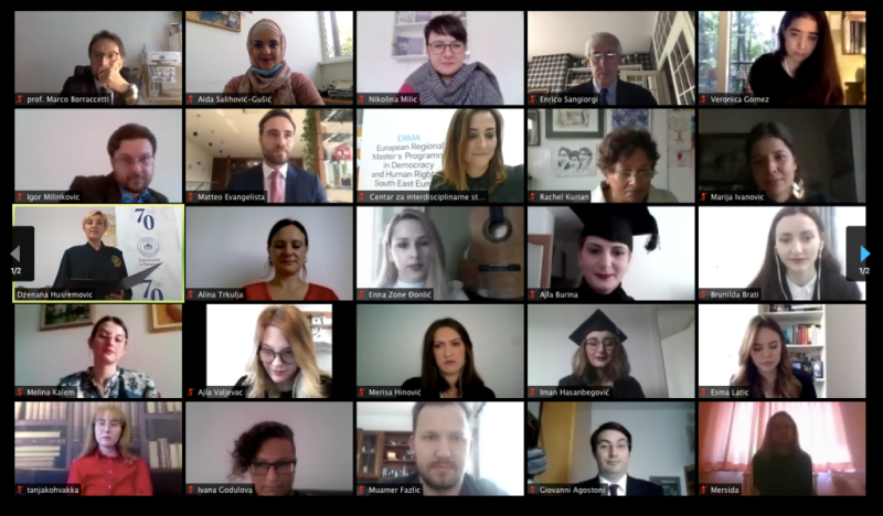 The introductory speech was given by Veronica Fabiana Gomez, the president of the Global Campus of Human Rights. The student representative for 2019/2020 Emina Ema Ibišević shared their experiences from this prestigious study program. Prof. Nenad Markovikj spoke to the guests attending the online ceremony, both as an alumnus and member of the International Academic Council.