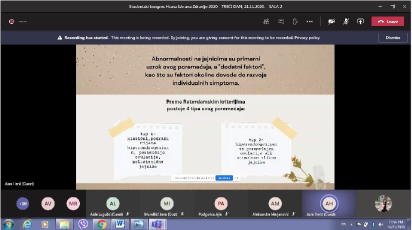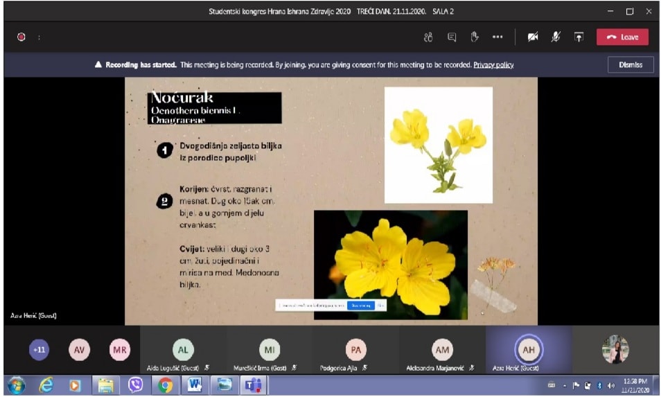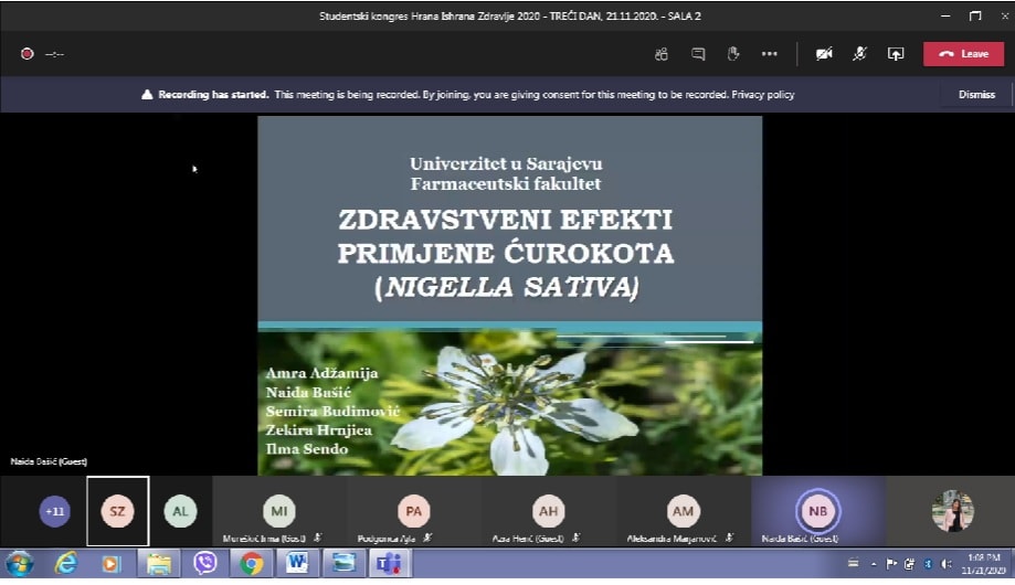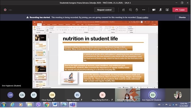 In Sarajevo from 19 to 21 November 2020, the 5th Student Congress Food-Nutrition-Health with international participation was held and organized by seven University of Sarajevo Faculties from Medical, natural-mathematical and biotechnical Sciences Groups and Humanities. The Congress’ ceremonial opening rook place at the Ibis Styles Sarajevo Hotel on 19 November, and due to the current epidemiological situation, the Congress was held online this year.