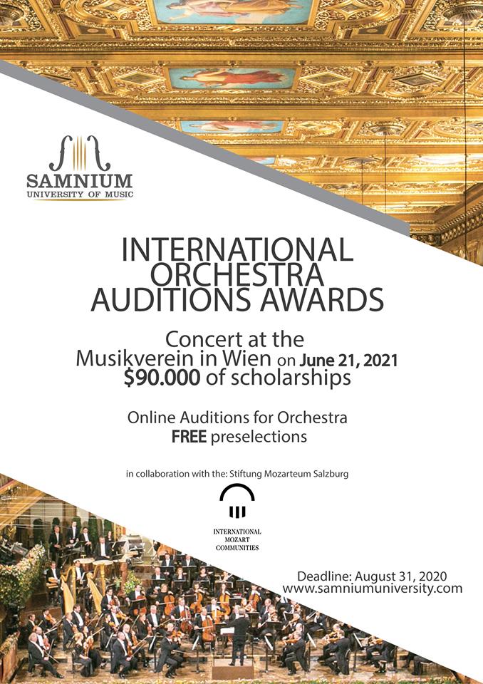 The International Orchestra Auditions Awards competition is intended for orchestral musicians over the age of 18 and offers 60 scholarships totaling $ 90,000, for the purpose of forming the Samnium Symphony Orchestra. In June 2021, as part of the European tour, this orchestra will perform in Italy and Austria, where it will play in the Vienna Musikverein.