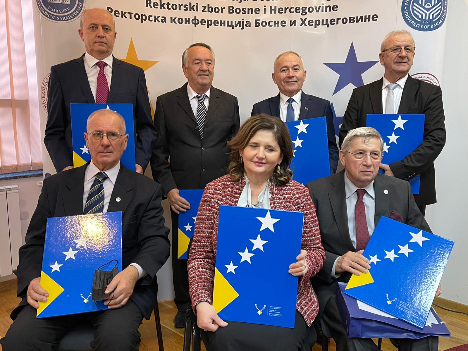 The winners of the Rectors’s Conference of BiH Plaque, awarded to those responsible for their outstanding contribution to the development and expansion of the reputation of universities in BiH, are: Academician Prof. Dr. Miloš Trifković, Prof. Dr. Sci. Dženana Gačo, Prof. Dr. Sci. Milan Kulić, Prof. Dr. Sci. Rajko Kuzmanović, Prof. Dr. Sci. Fuad Ćatović, Prof. Dr. Sci. Vlado Majstorović, Prof. Dr. Sci. Mitar Novaković, Prof. Dr. Sci. Sabahudin Ekinović, Dr. H. C. and posthumously Prof. Dr. Sci. Stefan Sunarić.