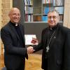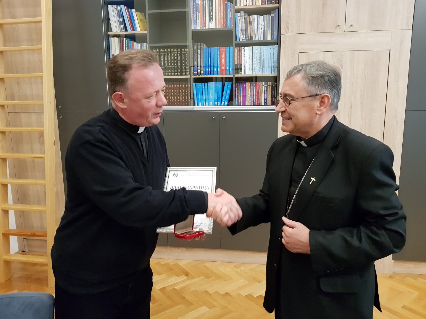 The interlocutors recalled the joyful event of the Apostolic Visit and the many days of students and professors in Skopje, which was a valuable experience for all. In gratitude, Bishop Stojanov presented Dean Tomašević with a gratitude plaquette to the KBF and a medallion with the image of St. Pope John XXIII and St. Mother Theresa produced on the occasion of the 29th Pope's Apostolic Journey. Rev. Stanušić also received the same gift.