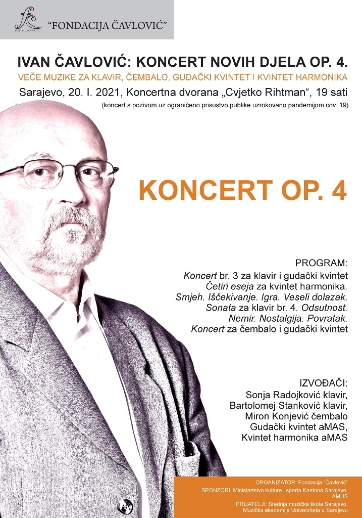 On Wednesday, 20 January 2021, at 19:00 in the concert hall "Cvjetko Rihtman" (Hall of the Sarajevo High School of Music), the fourth all-night concert of new works by Ivan Čavlović will be held with the following program and performers: