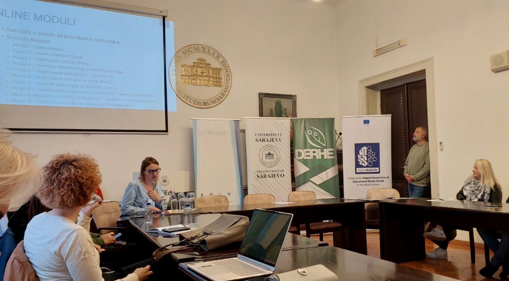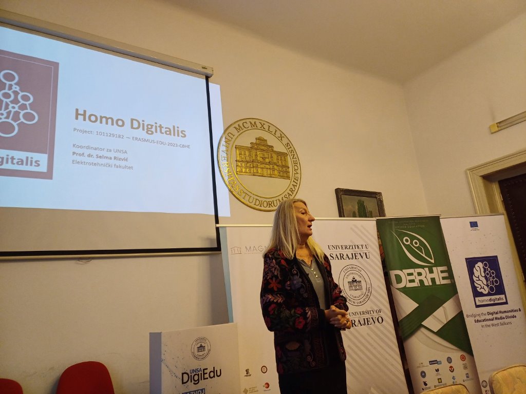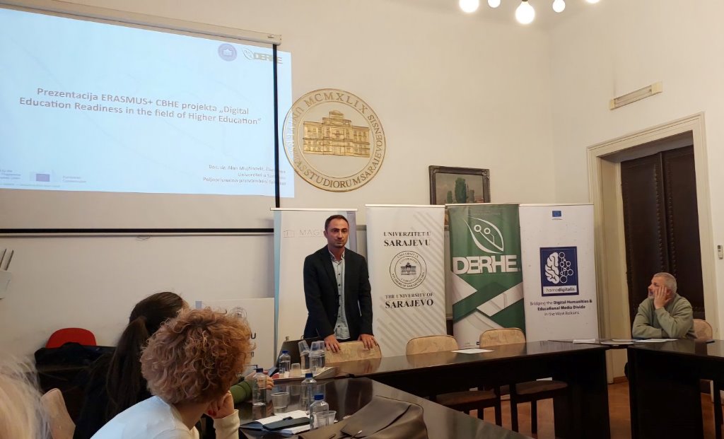 During the event, two Erasmus+ projects aimed at modernizing the teaching process and academic staff competencies were presented: HomoDigitalis - “Bridging the Digital Humanities and Educational Media Divide in the West Balkans”, which supports the development of digital learning facilities and the introduction of digital techniques in teaching and research in humanities, which was presented by Prof. Dr. Selma Rizvić, and the project “Digital Education Readiness in the Field of Higher Education” (DERHE), which was presented by Assoc. Prof. Dr. Alen Mujčinović.