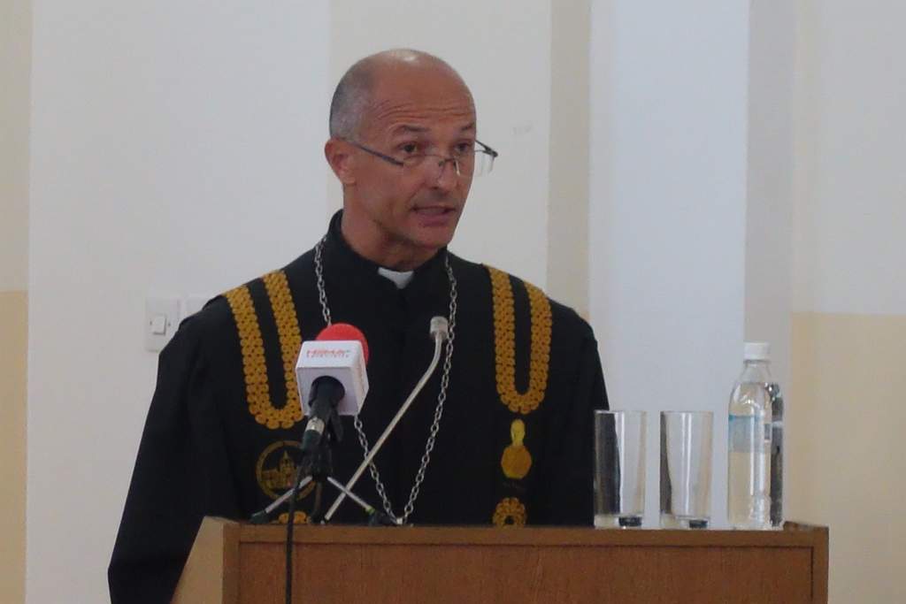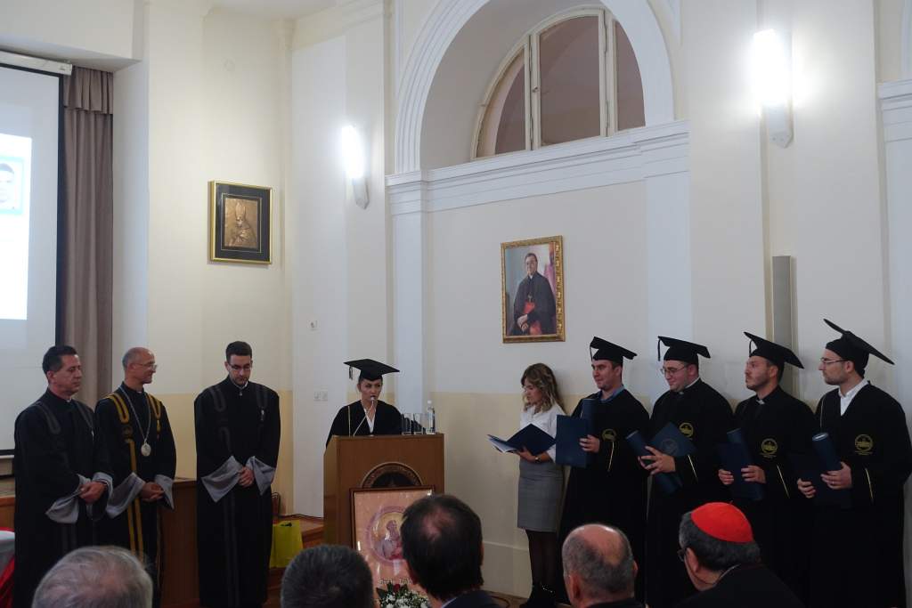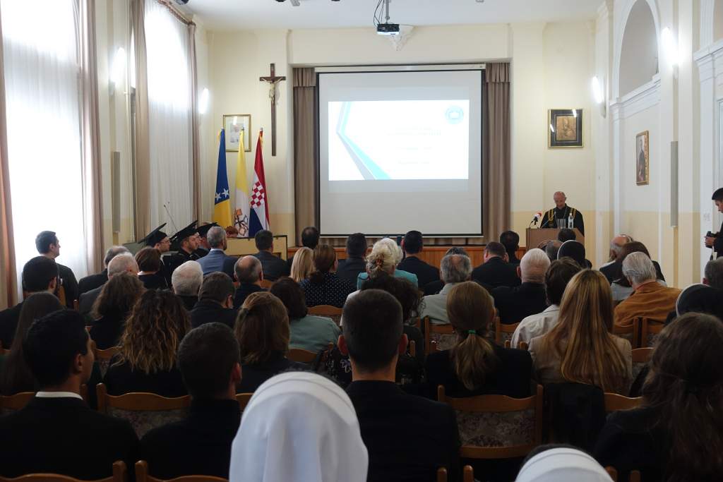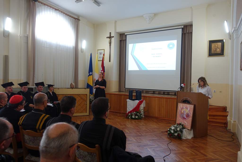 Welcome address was delivered by Dean Darko Tomašević thanking everyone who came “to share joy on the occasion of the Faculty of Catholic Theology Day, which has been for 128 years serving the Church and the people of Bosnia and Herzegovina.” He briefly presented the KBF activities in academic 2017/2018 by mentioning the organization of several scientific conferences and theological forums and various editions. He also added that the graduated Masters of Theology are “cake cream” of their work.