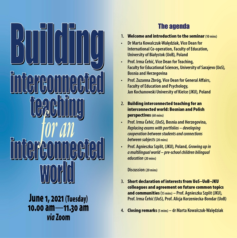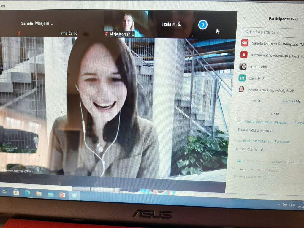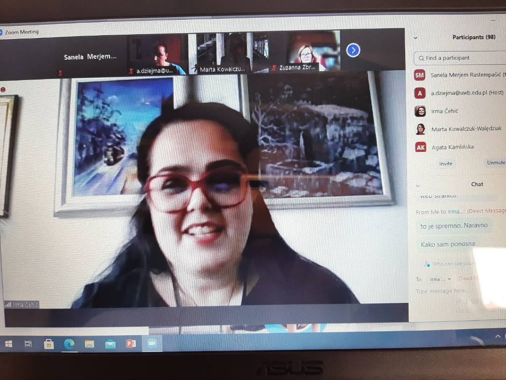 At the webinar organized by Prof. Dr. Marta Kowalczuk-Walędziak, Vice-Dean for International Cooperation of the Faculty of Education, University of Bylastock “Building interconnected teaching for the interconnected world: Bosnian and Polish perspective” held on 1 June 2021. Prof. Dr. Irma Čehić, Vice Dean for Teaching and Student Issues, presented the positive experiences of integrated evaluation of student work, i.e. the development of a development portfolio as a final exam – “Replacing exams with portfolios - developing cooperation between students and connection between subjects.”