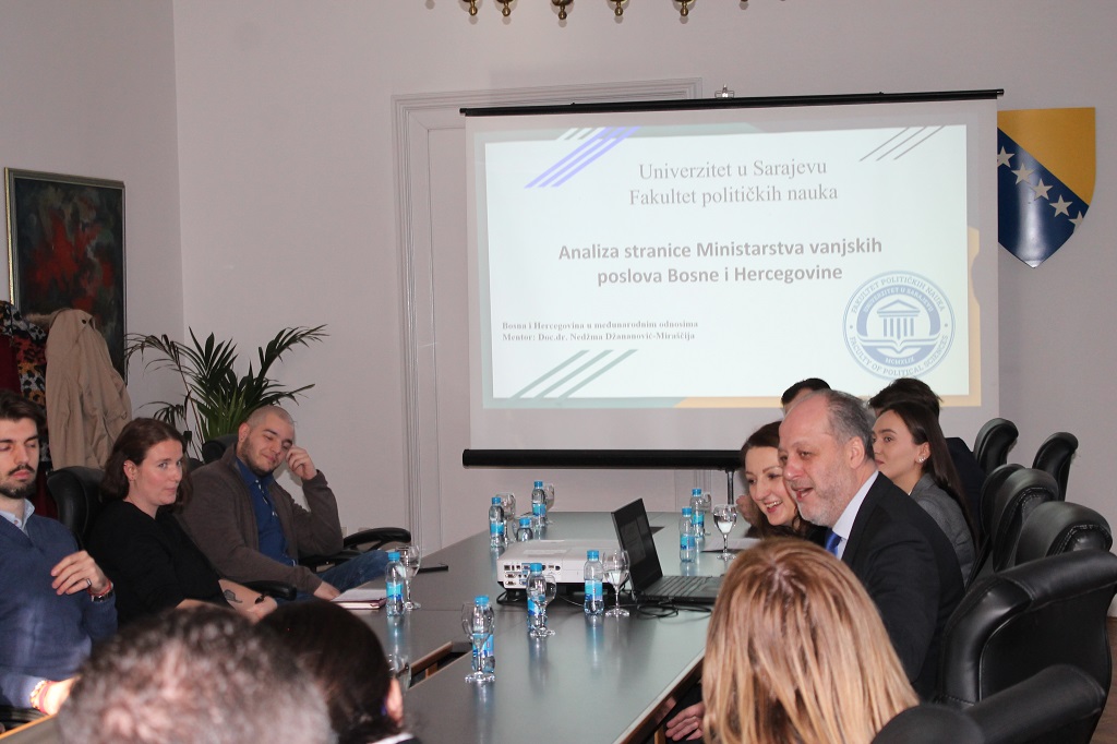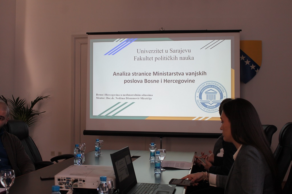 The BiH Ministry of Foreign Affairs has invited a group of students from the second cycle of studies in international relations and diplomacy from the Faculty of Political Sciences at the University of Sarajevo to present the results of their research at headquarters. Under the mentorship of Prof. Dr. Nedžma Džananović Miraščija, within the subject “BiH in International Relations”, they prepared an analysis of the official web site of the Ministry of Foreign Affairs. They presented their findings and recommendations for improvement to colleagues from the Planning and Information Department and the Public Relations Office and the Department of Communication and Informatics.