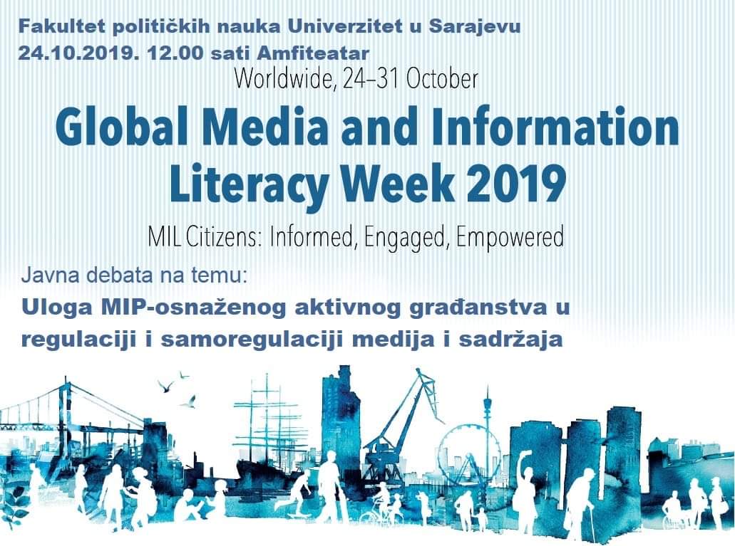 On 24 October 2019, a public lecture and discussion with students marked the beginning of Global Media and Information Literacy Week at the Faculty of Political Science, University of Sarajevo.  Doz. Dr. Emir Vajzović, Prof. Dr. Lejla Turčilo, and a representative of the Communications Regulatory Agency Lea Čengić and a representative of the Press Council Ljiljana Zurovac spoke with the Faculty of Political Sciences students on the topic of the importance of MIL empowered active citizen in media regulation and self-regulation.