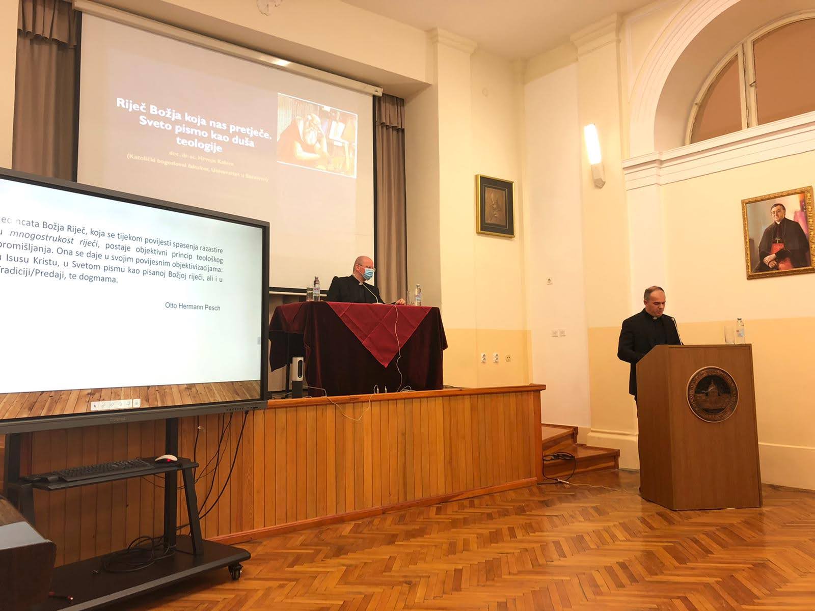 The symposium was opened by a lecture by Doz. Dr. Hrvoje Kalem, professor of fundamental theology at the Faculty of Catholic Theology, University of Sarajevo, entitled “The Word of God that overtakes us, the Bible as the soul of theology.”