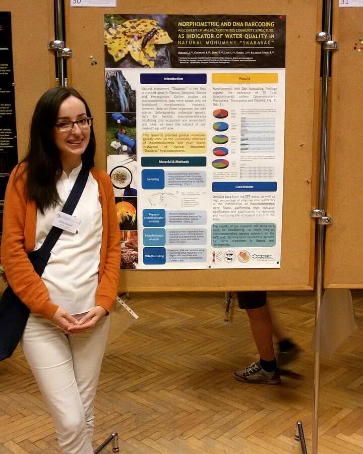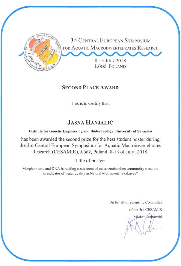 Jasna Hanjalić, MA - Institute of Genetic Engineering and Biotechnology at the University of Sarajevo senior expert and PhD student at the University of Sarajevo, won the second place for the best scientific poster presentation titled Morphometric and DNA barcoding assessment of macrozoobenthos community structure as indicator of water quality in Natural Monument ‘Skakavac’ at the symposium “3rd Central European Symposium for Aquatic Macroinvertebrates Research (CESAMIR)" held in Łódź, Poland (8-13 July, 2018).