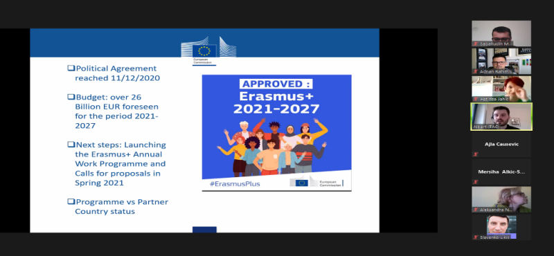 The project team will launch a series of online lectures and presentations, starting with the first held by Mr. Albert Sesé Ballarta, Policy Officer in charge of the Western Balkans in the Directorate-General for Education, Youth, Sport and Culture. Mr. Ballart spoke about the Erasmus + program, the benefits of the program, the challenges posed by the coronavirus pandemic, and what awaits us in the new Erasmus + program package 2021-2027, emphasizing certain changes when it comes to the participation of Bosnia and Herzegovina.