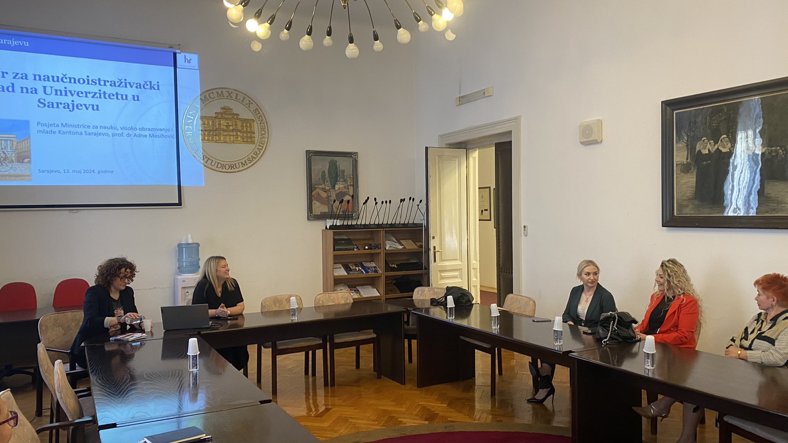 On 14 May 2024, a meeting was held between Minister of Science, Higher Education, and Youth of the Canton of Sarajevo, Prof. Dr. Adna Mesihović, and staff from the Centre for Research and Development and the Service for Research and Development at the University of Sarajevo. The delegation from the Ministry of Science, Higher Education, and Youth included Mrs. Azemina Njuhović, Assistant Minister of Science, and Mrs. Dženita Viteškić, Assistant Minister of Higher Education.