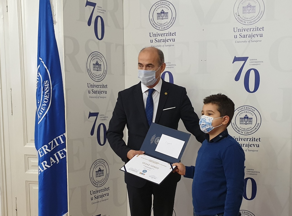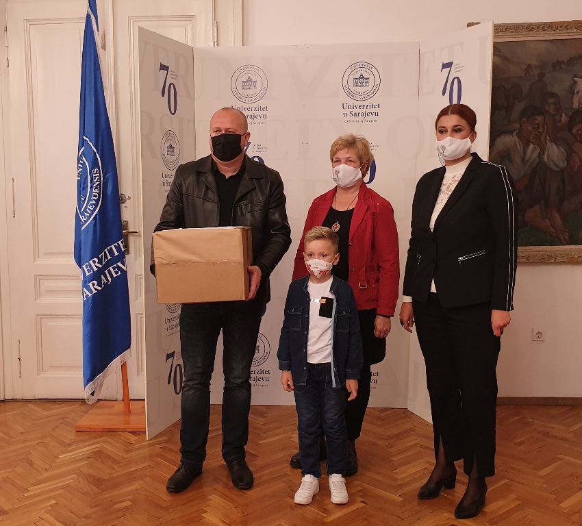 The awards were presented to students Vedad Honda, Harun Hadžić and Alija Dupovac by Prof. Dr. Rifat Škrijelj, University of Sarajevo Rector, and M.Sc. sc. Nadina Grebović-Lendo, coordinator of the Action Group of the National Day of Library Awareness in BiH in front of the University of Sarajevo. On this occasion, gift packages of books for primary school libraries attended by awarded students were handed over.