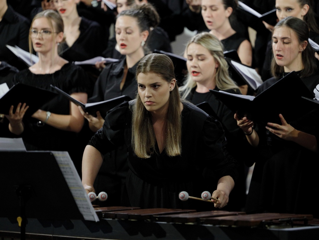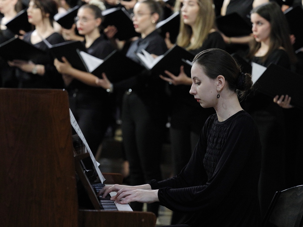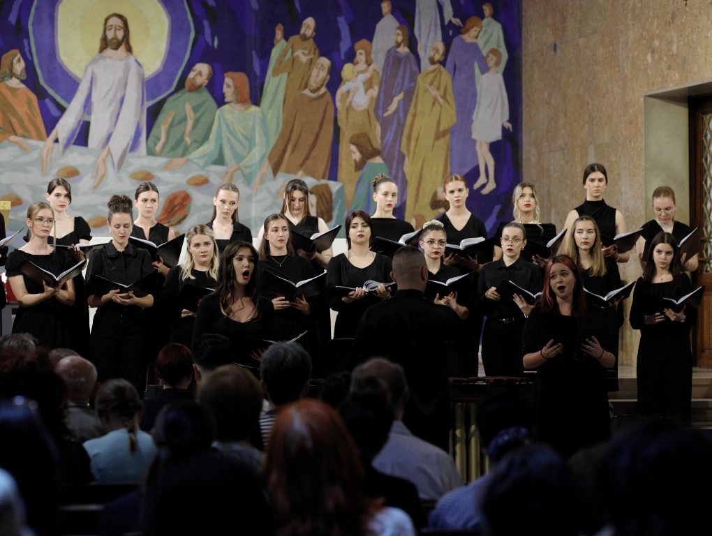 The repertoire also included Jesus bleibet meine Freude from the cantata BWV 147 by J. S. Bach, and then Sure on This Shining Night by S. Barber, Ballade to the Moon from Three Nocturnes for choir and piano by D. Elder, performed with the choir by pianist Iva Lazić, student of the Department of Piano, Harp, Percussion and Related Instruments in the class ofPprof. Dragan Opančić, while percussionist Emili Mišić, a student of the Department of Harp, Percussion and Related Instruments in the class of Prof. Davor Maraus.