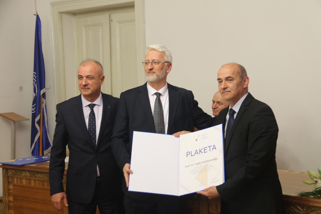 The winners of the Rectors' Conference “Plaque” for their outstanding contribution to the development of universities through outstanding work in the scientific, teaching and professional fields, and spreading the reputation of universities in Bosnia and Herzegovina, are: Academician Dr. Dragoljub Mirjanić (University of Banja Luka), Prof. Dr. Atif Hodžić (University of Bihać), academician Dr. Mladen Bevanda (University of Mostar), Prof. Dr. Tarik Zaimović (University of Sarajevo), Prof. Dr. Izudin Kapetanović (University of Tuzla), Prof. Dr. Jusuf Duraković (University of Zenica), Prof. Dr. Fuad Hadžikadunić (University of Zenica), and posthumously Prof. Dr. Hasan Muratović, professor emeritus of the University of Sarajevo, posthumously Prof. Dr. Elvedin-Edo Hanić, professor emeritus Džemal Bijedić University of Mostar, and posthumously Prof. Dr. Safet Krkić - Džemal Bijedić University of Mostar.