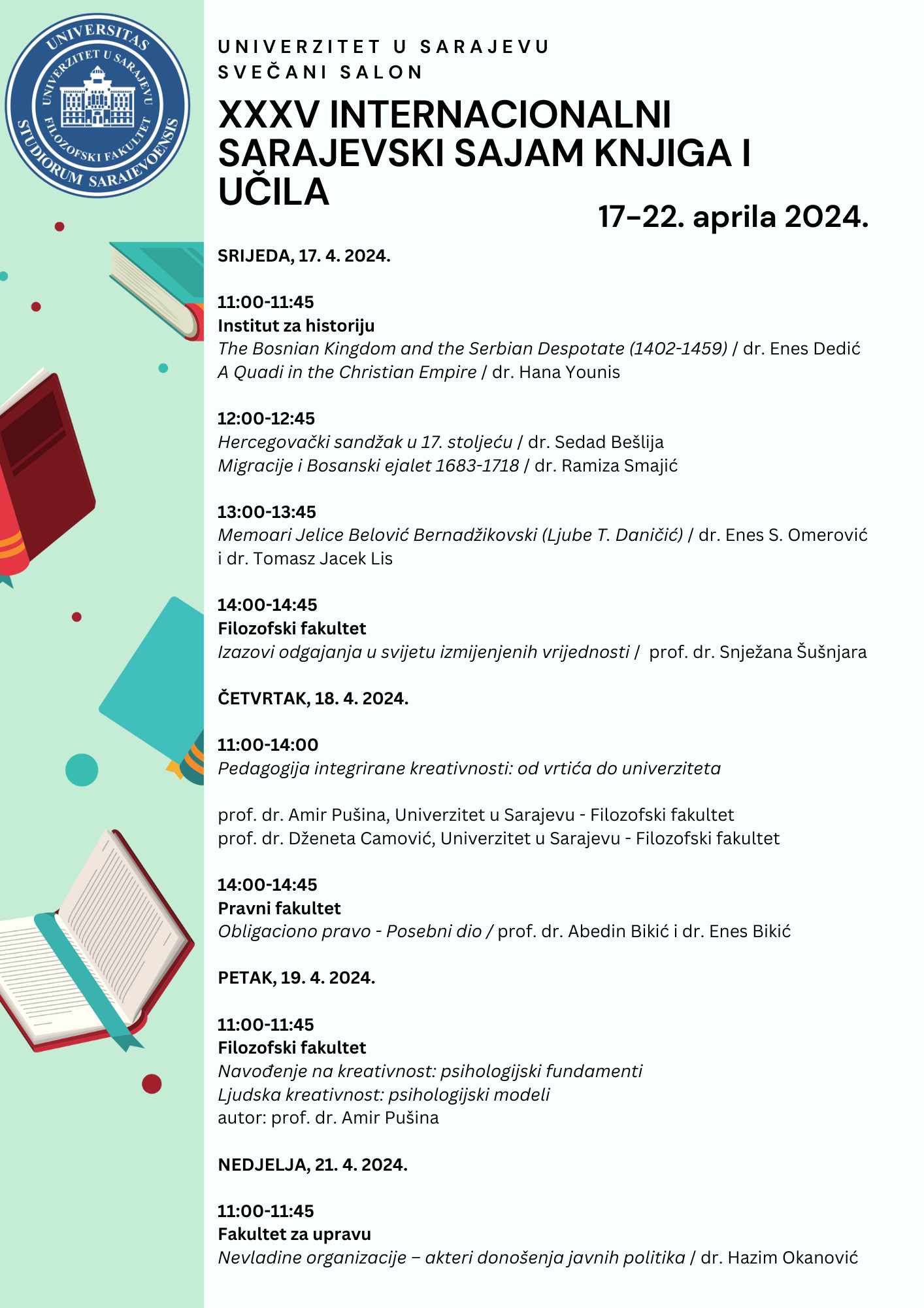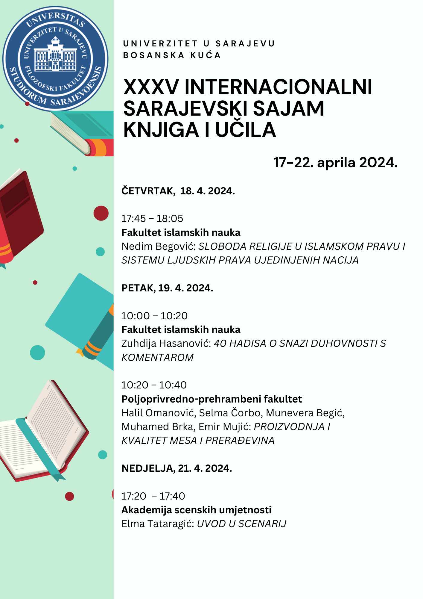 In the Grand Salon and Bosnian House, 12 book promotions will be held, featuring publications from the Institute for History, Faculty of Philosophy, Faculty of Law, Faculty of Islamic Sciences, Faculty of Agriculture and Food Science, Faculty of Management, and Academy of Performing Arts.