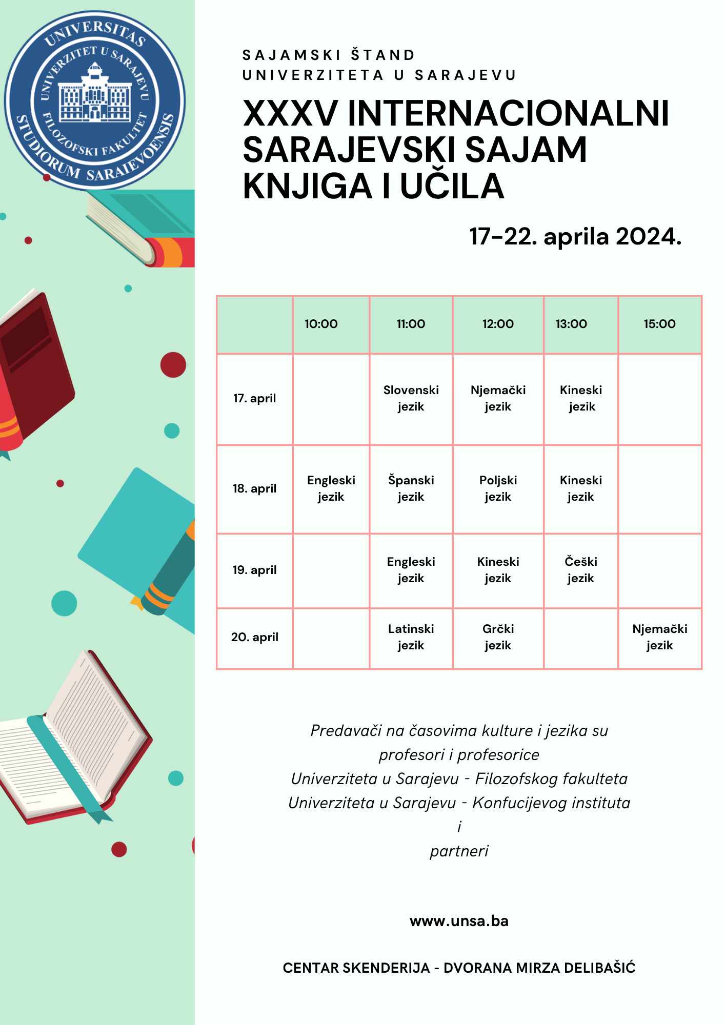 At the university's stand, Faculties, Academies, and Institutes will showcase their developed publishing activities, including scientific production. There will be promotional language and culture classes for elementary school students, high school students, and librarians. The planned language promotions include Slovenian, English, Spanish, Latin, German, Polish, Chinese, Greek, and Czech. The language and culture classes will be taught by professors from the Faculty of Philosophy and the Confucius Institute of the University of Sarajevo.