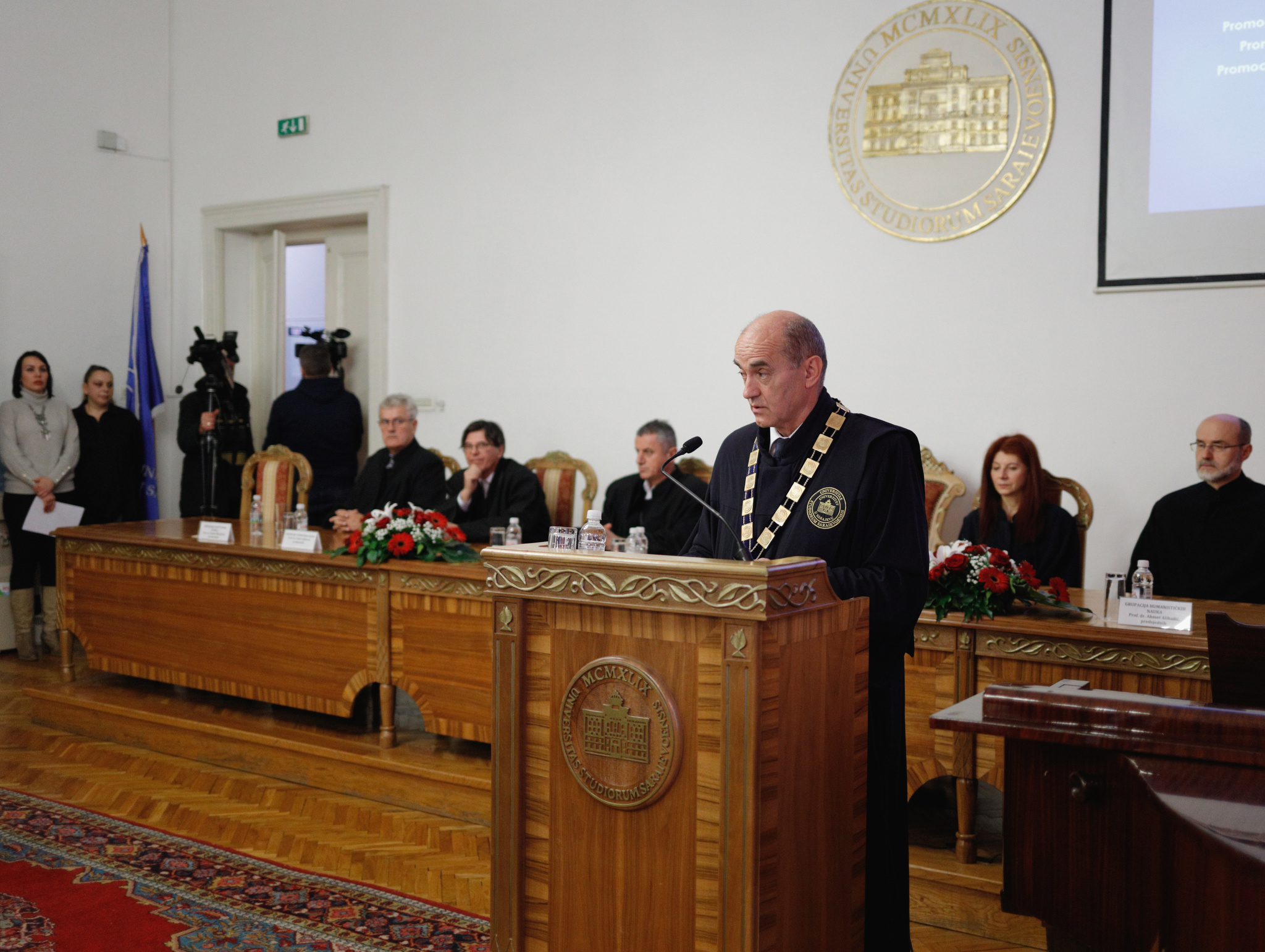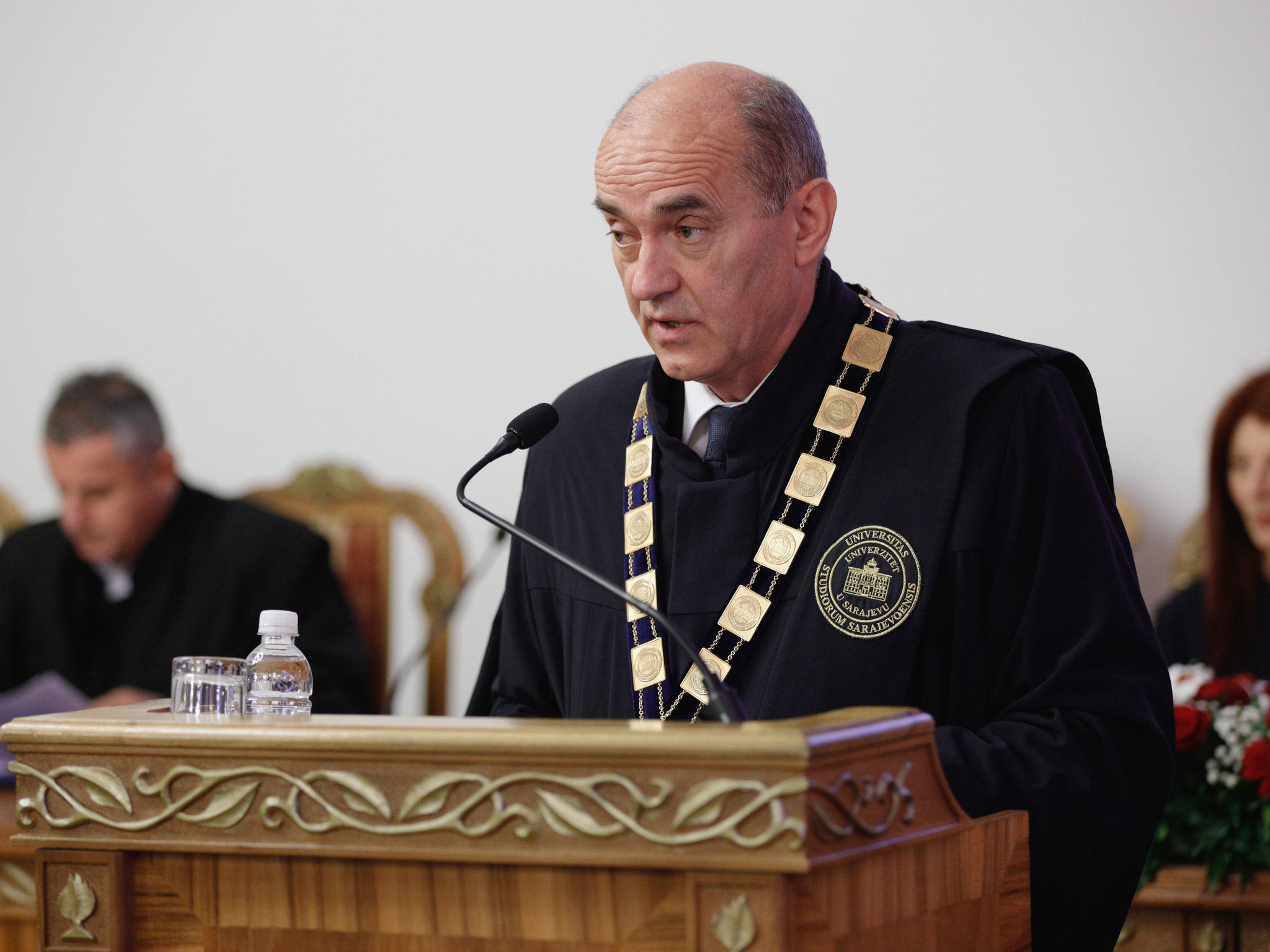 With welcoming words, the rector of the University of Sarajevo, Prof. Dr. Rifat Škrijelj emphasized that this ceremony and three very significant promotions confirm the efforts of the academic community to continue acting in the direction of creating key assumptions for the further development and progress of the University of Sarajevo.