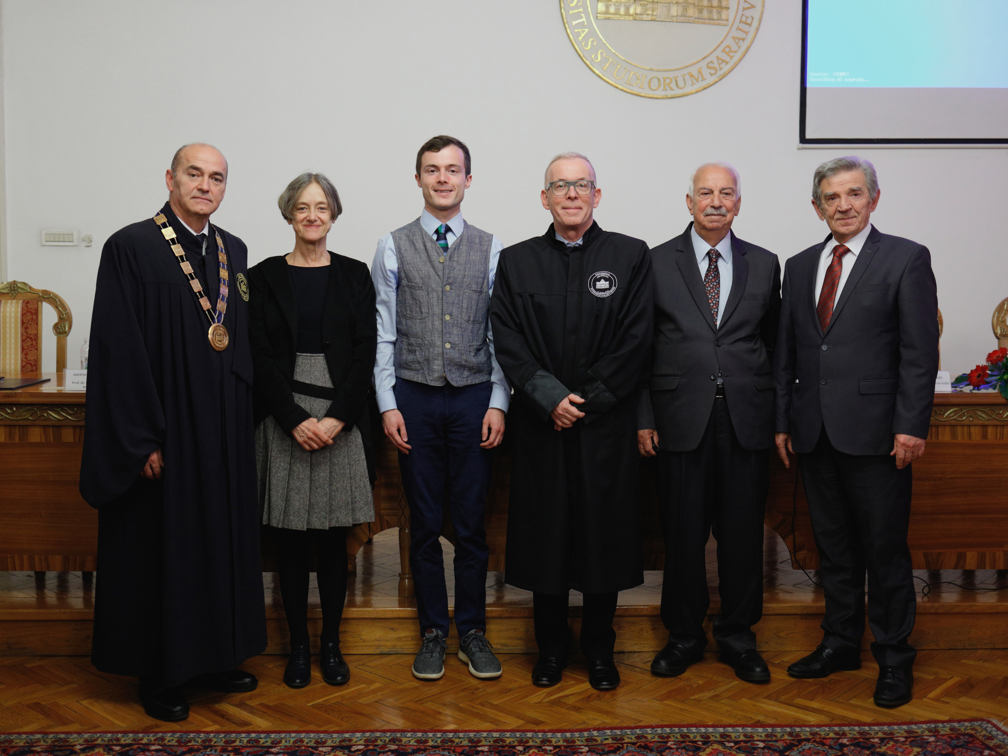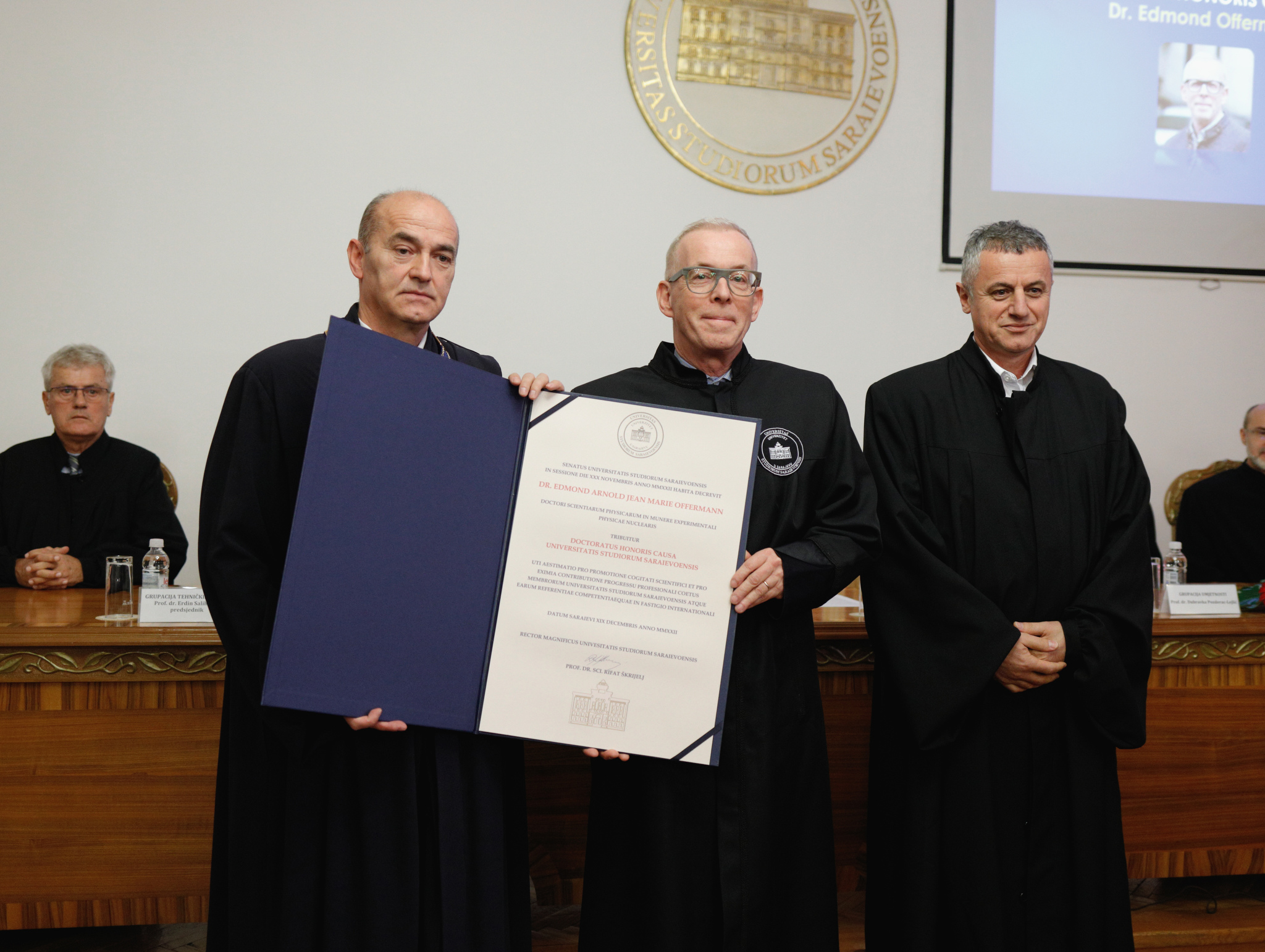 The honorary doctorate of the University of Sarajevo (gradus doctoris honoris causa) was conferred to Dr. Edmond Offermann, doctor of physical sciences in the field of experimental nuclear physics, for his exceptional contribution to the development of science, social and public life, as well as the affirmation of the University of Sarajevo and the expansion of its reputation at the domestic and international level.