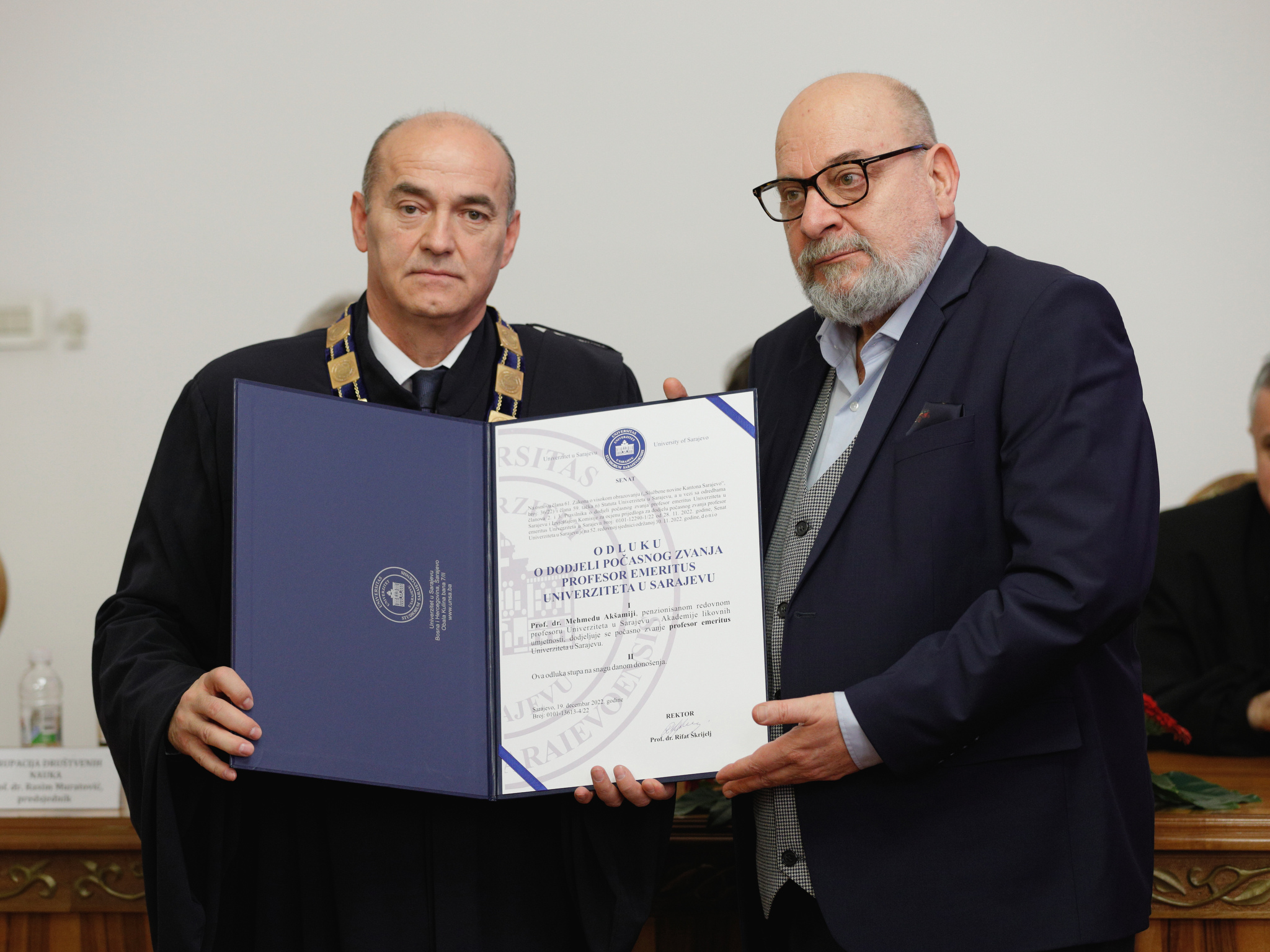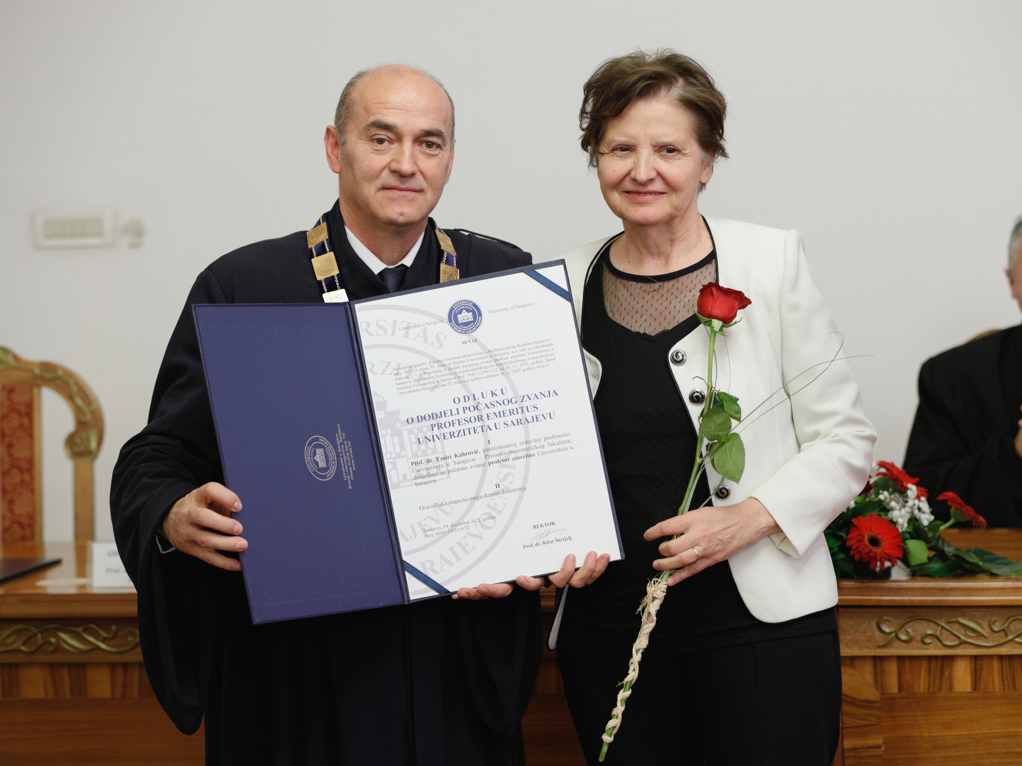 The honorary title of professor emeritus is awarded to retired full professors of the University of Sarajevo who, over a long period of time, have continuously contributed to the improvement and development of scientific and artistic research work, the development and progress of the University and its faculties/academies, and the teaching process at the University, and have gained an international reputation.