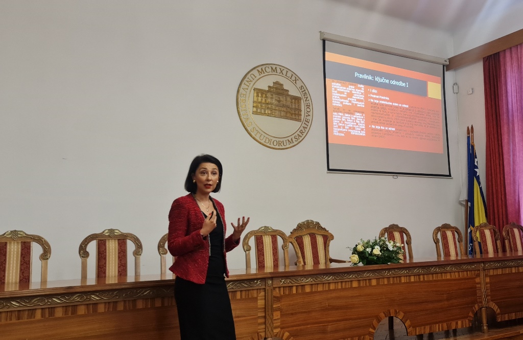 The Rulebook on the Management of Intellectual Property Rights at the University of Sarajevo was presented by Prof. Dr. Iza Razija Mešević, Project Coordinator, Deputy Dean for International Cooperation at the Faculty of Law, University of Sarajevo.