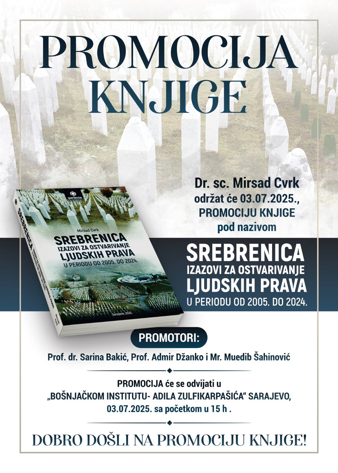 Dr. sc. Mirsad Cvrk održat će promociju knjige "Srebrenica : izazovi za ostvarivanje ljudskih prava u periodu od 2005. do 2024." u Bošnjačkom institutu – Fondacija Adila Zulfikarpašića, 3. jula sa početkom u 15h.