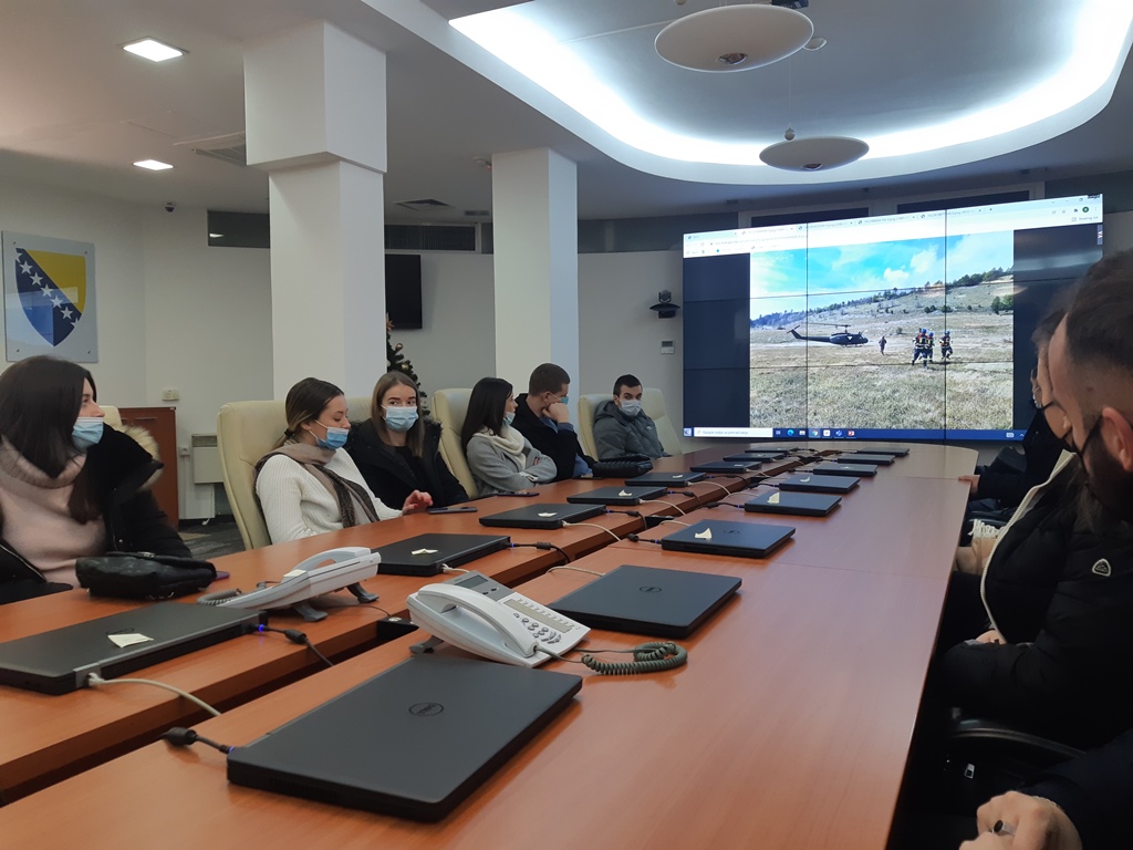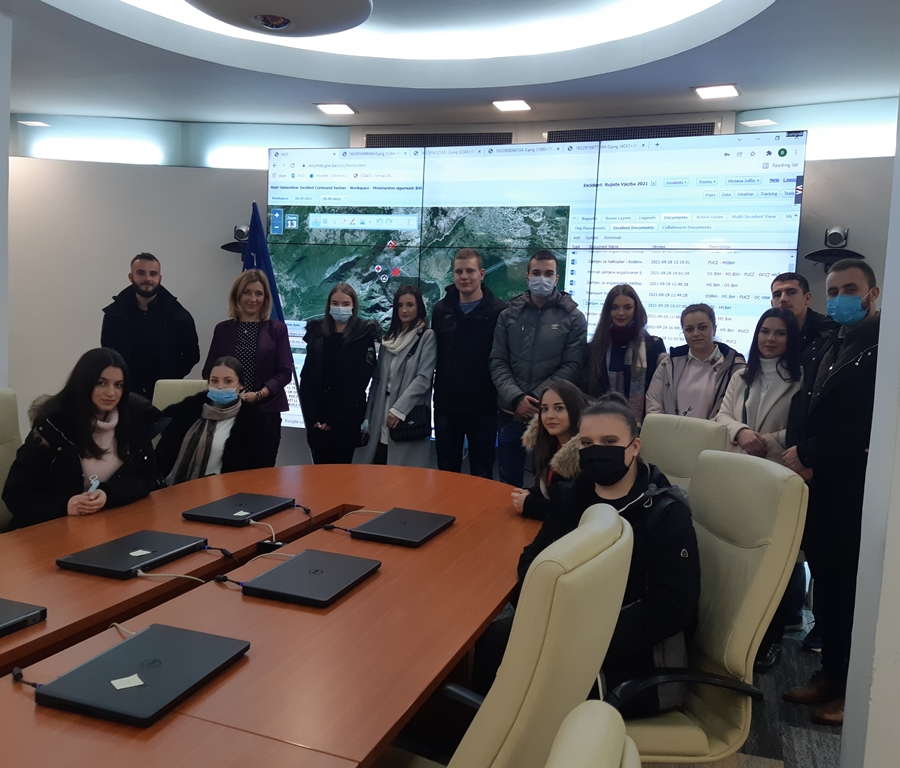 On 13 and 14 December 2021, third and fourth year students of the Faculty of Criminalistics, Criminology and Security Studies at the University of Sarajevo visited the Operational and Communication Center of Bosnia and Herzegovina. This study visit was realized within the subject "Crisis Management" of the first cycle of studies and "Operational Centers and Communication Systems" of the integrated study "Crisis Management". Accompanied by assistant Kenan Hodžić, the students visited the Ministry of Security of Bosnia and Herzegovina in order to get acquainted with the situation and activities of the Sector for Protection and Rescue and the Operational and Communication Center of Bosnia and Herzegovina.