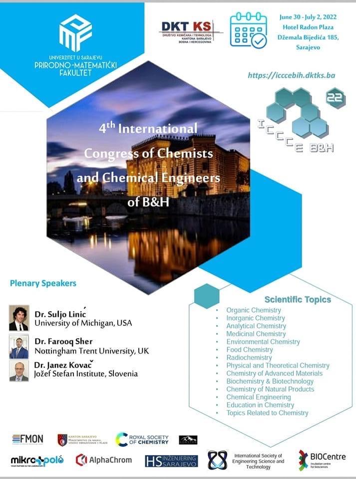 4th International Congress of Chemists and Chemical Engineers of Bosnia and Herzegovina (4. Međunarodni kongres hemičara i hemijskih inženjera BiH) predstavlja međunarodni kongres koji se bavi najnovijim dostignućima i izazovima u mnogim granama hemije. Renomirani naučnici iz skoro svih dijelova svijeta izlagat će posebne tematske cjeline radi poticanja dijaloga i akademskog umrežavanja u cilju olakšavanja daljnjih mogućnosti istraživanja i uspostavljanja trajnih veza među obrazovnim i naučno-istraživačkim institucijama. Kongres predstavlja nastavak međunarodne saradnje istraživača iz različitih oblasti hemije, hemijskih tehnologija, hemije okoliša i srodnih oblasti. Područja naučnog istraživanja ovog kongresa su od vitalnog interesa za integraciju BiH u Evropu, kao i uključivanje naše naučne javnosti u svjetski aktuelne tokove jer su rezultati ovakvih naučnih istraživanja dobrim dijelom fokusirani na obnovljive izvore energije, klimatske promjene, sofisticirane naučne metode mjerenja, sintezu i karakterizaciju novih spojeva, iskoristivost novih spojeva za liječenje, kvalitet i monitoring zraka, vode, namirnica i slično što direktno pridonosi očuvanju ekosistema i njihovog biodiverziteta. U okviru Kongresa obrađuju se i trenutno aktuelne teme vezane za svjetsku epidemiološku situaciju prouzrokovanu COVID-19, kao i neke druge teme vezane za javno zdravstvo, dijagnostiku, prevenciju i terapiju (sekcija Medicinska hemija).
