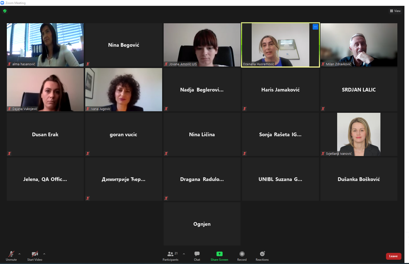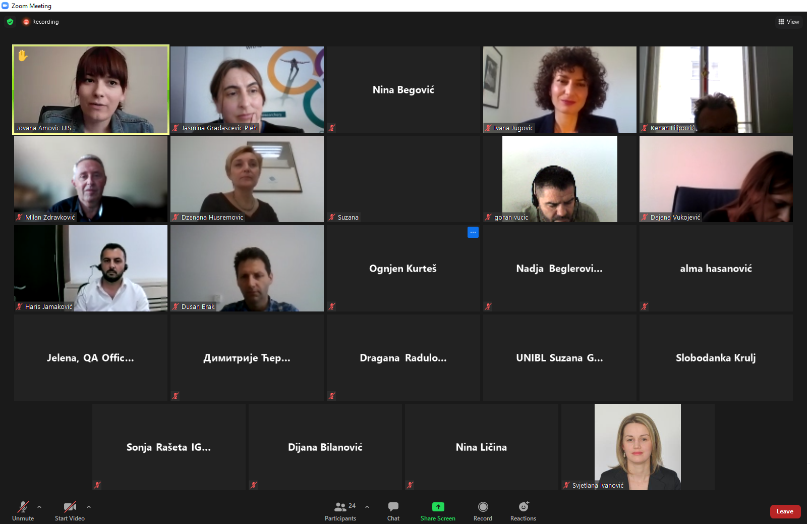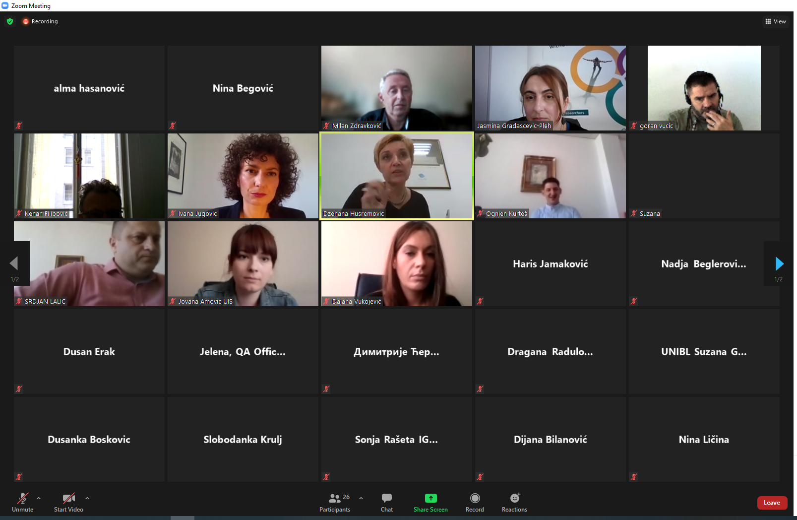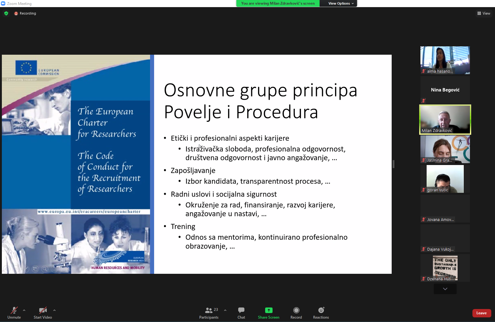 Prorektorica Husremović je istakla značaj procesa HRS4R u kojem se trenutno nalaze Univerzitet u Banjoj Luci, Univerzitet u Istočnom Sarajevu i Univerzitet u Sarajevu. Podsjetila je da priznanje „Izvrsnost u istraživanju“, koje su dobila navedena tri univerziteta u Bosni i Hercegovini, dodjeljuje Evropska komisija za istraživačke institucije koje ulažu dodatne napore u cilju unapređenja položaja istraživača u skladu sa Evropskom poveljom za istraživače i Kodeksom zapošljavanja istraživača. Ciljeve projekta i samog webinara prezentirala je koordinatorica Gradaščević-Pleh pri čemu je istakla značaj usklađivanja univerzitetskih politika zapošljavanja istraživača (OTM-R) sa Evropskom poveljom za istraživače i Kodeksom zapošljavanja istraživača kao i samim ERA prioritetom otvorenog tržišta rada za istraživače.