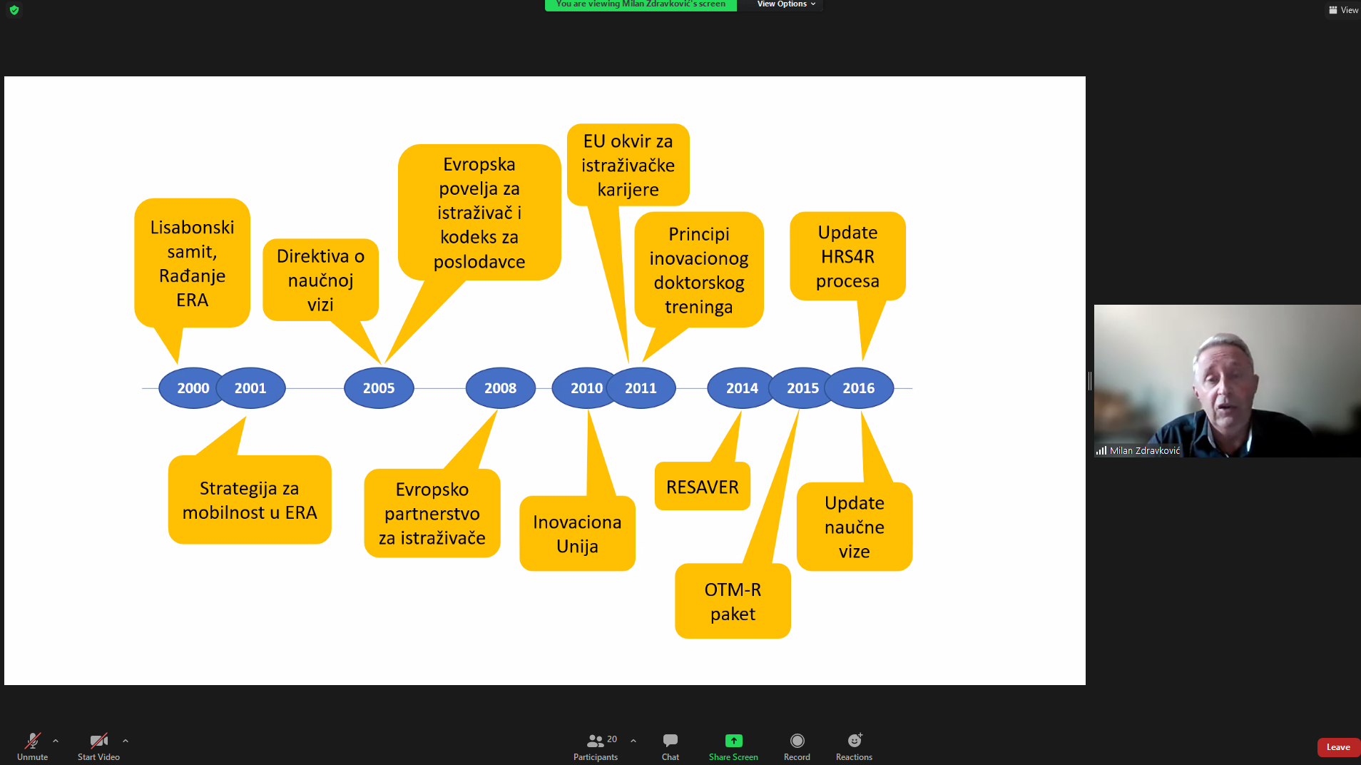 U nastavku programa prof. dr. Milan Zdravković, vodeći recenzent HRS4R procesa sa Univerziteta u Nišu prezentirao je EU okvir otvorenog i transparentnog zapošljavanja, zasnovanom na zaslugama (OTM-R). Dr. Ivana Jugović, HRS4R koordinatorica sa Instituta za društvena istraživanja u Zagrebu (IDIZ) osvrnula se na iskustva IDIZ-a u pripremi i implementaciji OTM-R politike i prezentirala primjere dobre prakse vezane za HRS4R proces.