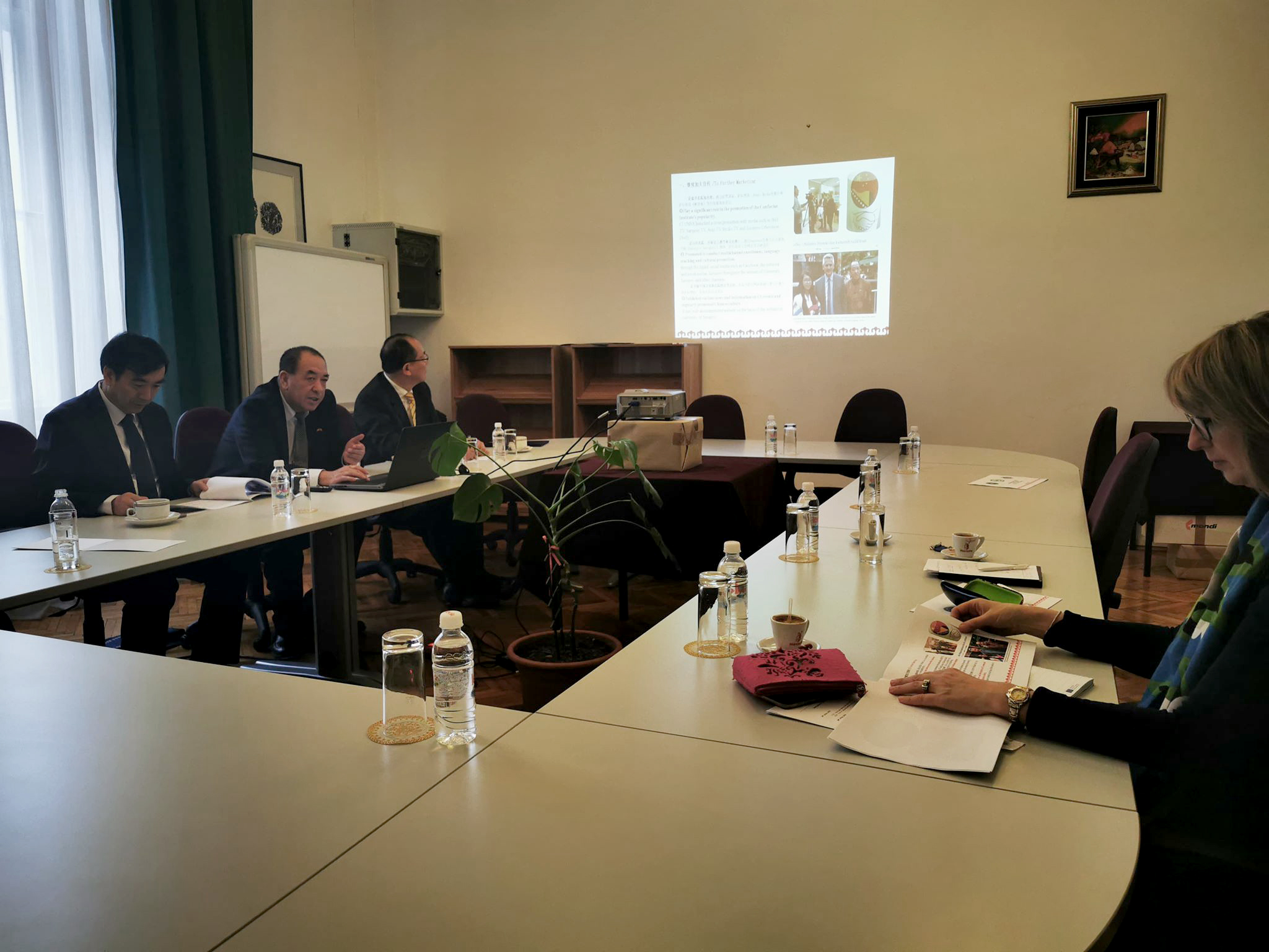 Direktni povod za posjetu je Konfučijev institut Univerziteta u Sarajevu koji je osnovan i razvija se kao zajednički projekat međunarodne saradnje dvaju univerzitetā. Na godišnjem sastanku je razmatran izvještaj o dosadašnjem djelovanju, radu i ostvarenim rezultatima Konfučijevog instituta Univerziteta u Sarajevu u 2019. godini, te su utvrđene smjernice za buduće djelovanje Instituta. Zajednički zaključak delegacija jeste da Konfučijev institut Univerziteta u Sarajevu već jeste i bit će i dalje značajan faktor u izgradnji čvrstih i prijateljskih odnosa između dviju zemalja.